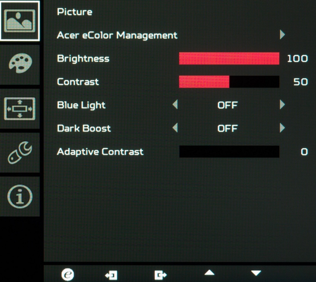 У новинки Acer нет каких-либо встроенных датчиков (освещенности, приближения), но в меню есть достаточно большое количество дополнительных параметров, напрямую влияющих на точность цветопередачи и качество картинки в целом. Для оценки их влияния мы выбрали два основных: Gamma и Dark Boost.