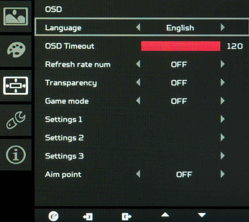 Третий раздел «OSD» предлагает пользователю выбрать язык локализации меню (русский присутствует), настроить время его отображения на экране и прозрачность. Можно активировать игровой режим, дополнительный наэкранный прицел (для читеров!) и выбрать один из сохранённых профилей со всеми настройками монитора. Но, если честно, то мы не видим большого смысла от такой возможности.