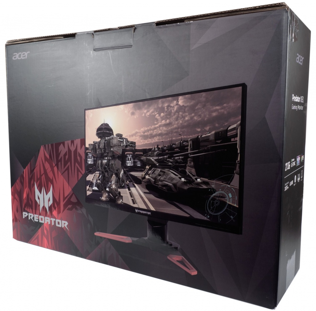 Монитор Acer поставляется в небольшой картонной коробке с качественной полиграфией. Дизайн упаковки нам с вами уже знаком и смотрится она современно и стильно – как и подобает достаточно дорогому игровому монитору.