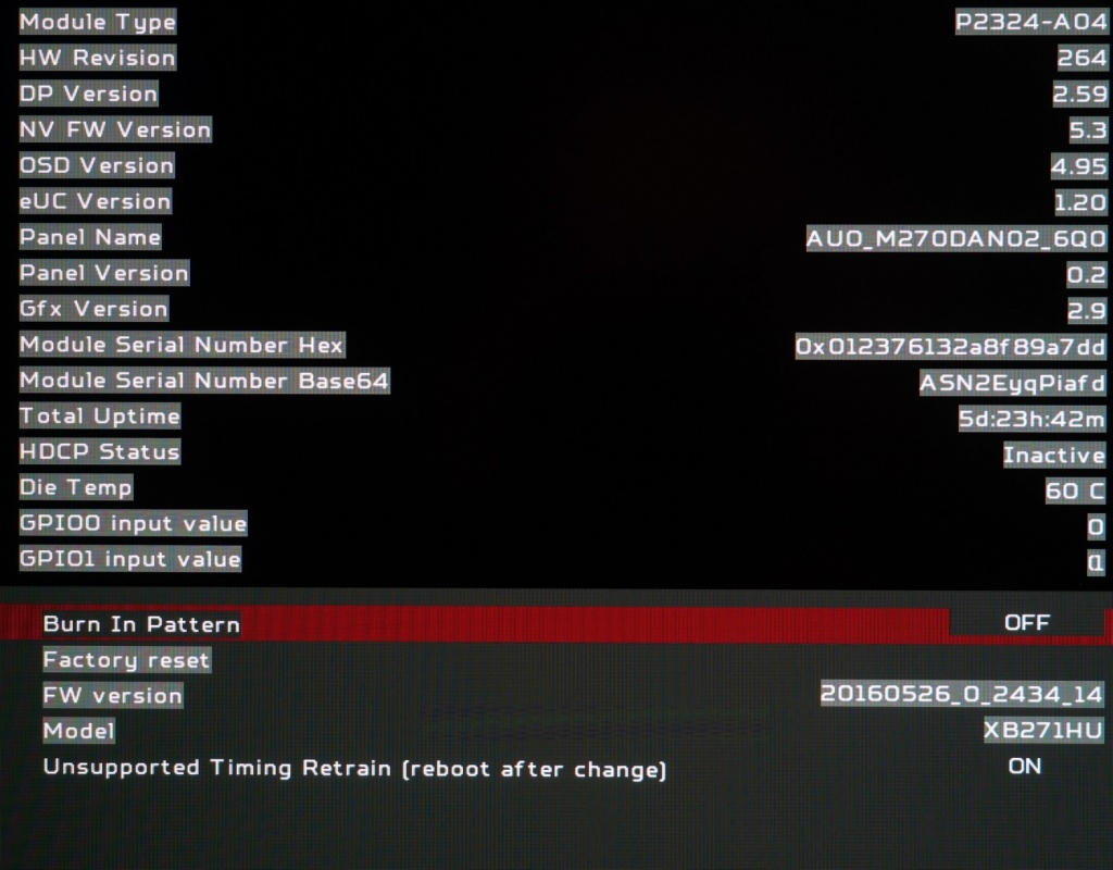 Благодаря этой возможности была подтверждена используемая модель матрицы, мы узнали версии самых разных элементов монитора, время наработки и т.д. Пользователь может активировать только режим Burn In, в остальном перед будет только справочная информация, никаких вам RGB Gain, OD и прочих пунктов. Для простого пользователя ничего полезного тут нет. Идём дальше.