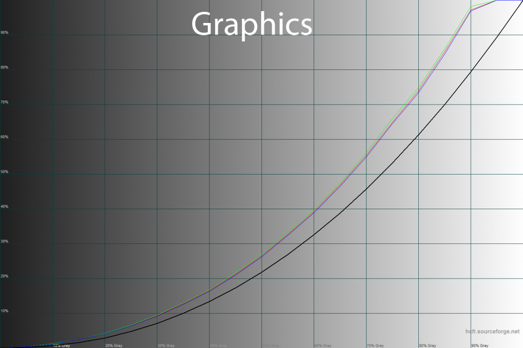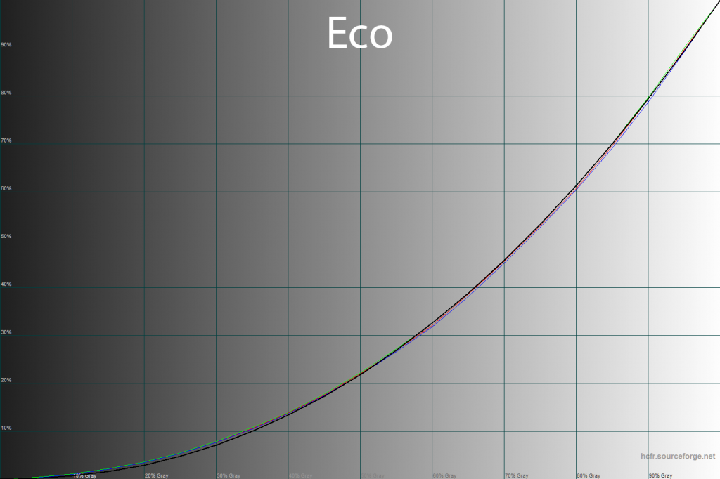 С помощью программы HCFR Colormeter и “откалиброванного” колориметра X-Rite Display Pro мною были изучены гамма-кривые во всех рассмотренных выше “режимах”, как изначально предустановленных, так и специально “разработанных”. Кроме того, по произведённым измерениям можно оценить расхождение серого клина (точек чёрно-белого градиента) на CIE диаграмме и сделать выводы о преобладании того или иного паразитного оттенка, либо его таковом отсутствии.