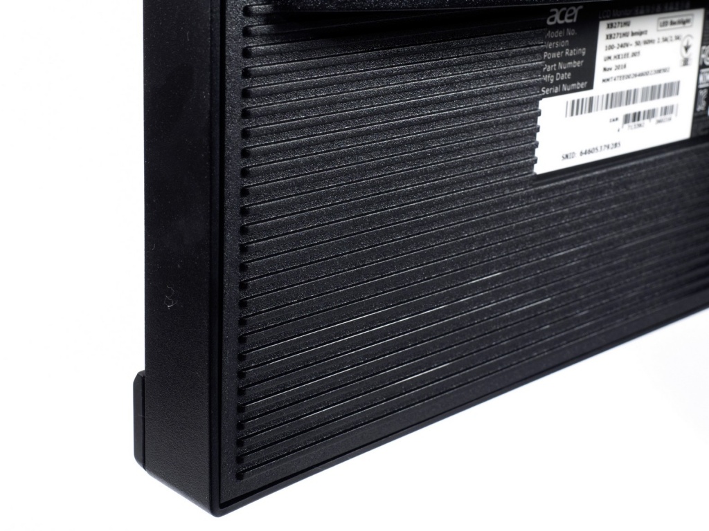 Качество сборки монитора соответствуют ценовому сегменту, в котором находится XB271HUbmiprz. Весь корпус сделан из матового пластика. Вся задняя часть выполнена с применением ребристых поверхностей. За счет них следы от пальцев рук практически не остаются видны. Детали монитора соединены друг с другом с минимальными зазорами по всей длине стыков.
