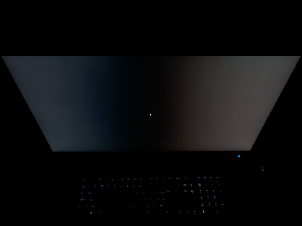 Теперь рассмотрим черный фон, оценив его равномерность по двум фотографиям с разной экспозицией, чтобы вы могли наглядно увидеть все проблемные зоны попавшего к нам в руки экземпляра. В данном случае XB271HUbmiprz – это классика жанра среди игровых WQHD IPS-type-решений. Стандартно высветленные углы панели с различными паразитными оттенками и в целом не самая лучшая равномерность по всей остальной площади.
