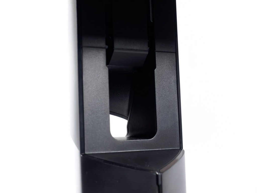 В нижней части центральной колонны находится специальное «окно», выполняющее роль системы прокладки кабелей. Решение простое, но в данном случае эффективное за счёт своих форм и расположения.