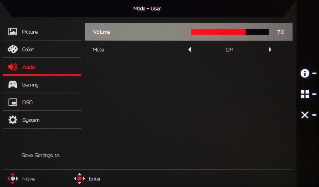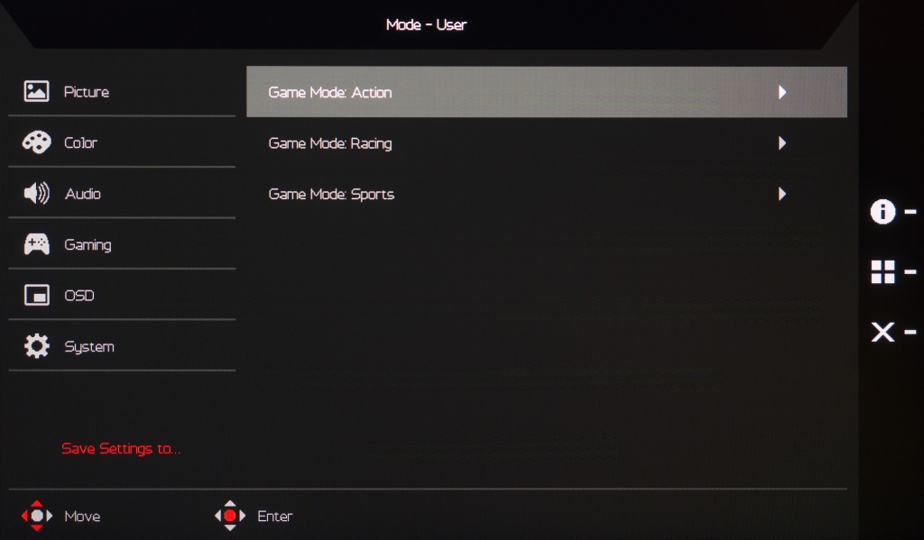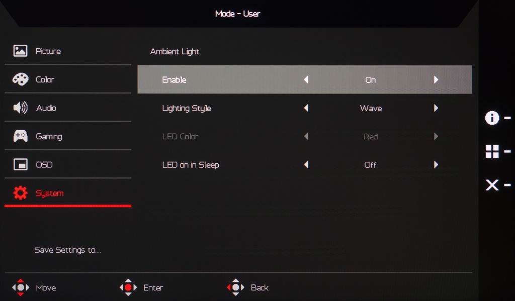 Система управления в изучаемом мониторе вполне обычная – как и у большинства решений от Acer. Она построена на базе блока с четырьмя физическими клавишами и пятипозиционного джойстика, размещённых в задней части корпуса с правой стороны.