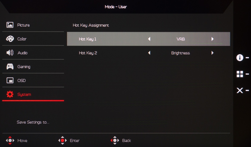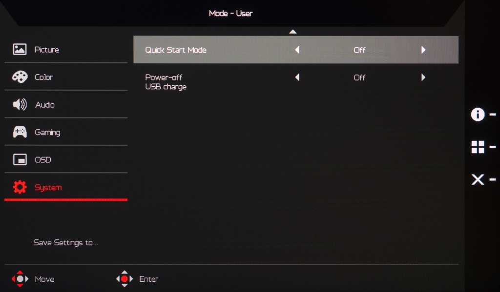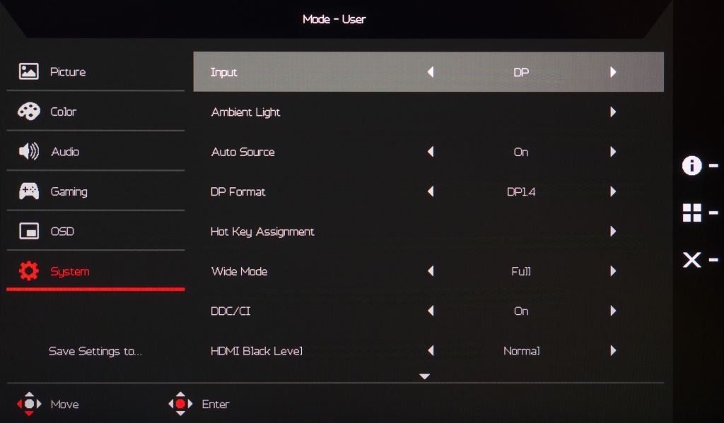 Изменить режим работы встроенного скалера, выбрать версию DP (по умолчанию выставлено DP 1.4), установить рабочий диапазон HDMI (уровень чёрного), переназначить две функции с быстрым доступом, выбрать интерфейс подключения – всё это можно в разделе «System». Здесь же предлагается активировать режима быстрого включения (без логотипа/заставки производителя) и изменение режима работы встроенного скалера.