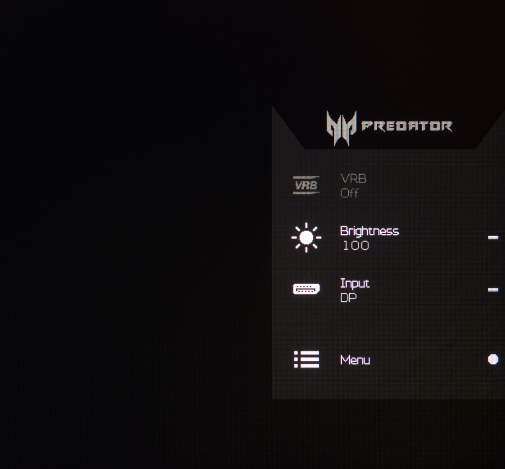 Кроме всего прочего в новинке, как почти во всех мониторах серии Nitro и последних Predator, представлена функция «вставки чёрного кадра» под названием Visual Response Boost (VRB – аналог ULMB во многих мониторах с модулем NVIDIA G-Sync и ELMB в мониторах ASUS), при активации которой подсветка матрицы переходит в режим стробления, что, несомненно, влияет не только на резкий прирост чёткости и плавности движущихся объектов на экране, но и увеличивает нагрузку на глаза. Смысл её использования в условиях и без того высокой скорости панели – минимальный, однако, её присутствие лишним точно не будет. Также стоит учесть, что её активация возможна только на частоте 100-120 Гц, а совместная работа с одной из систем адаптивной синхронизации невозможна.