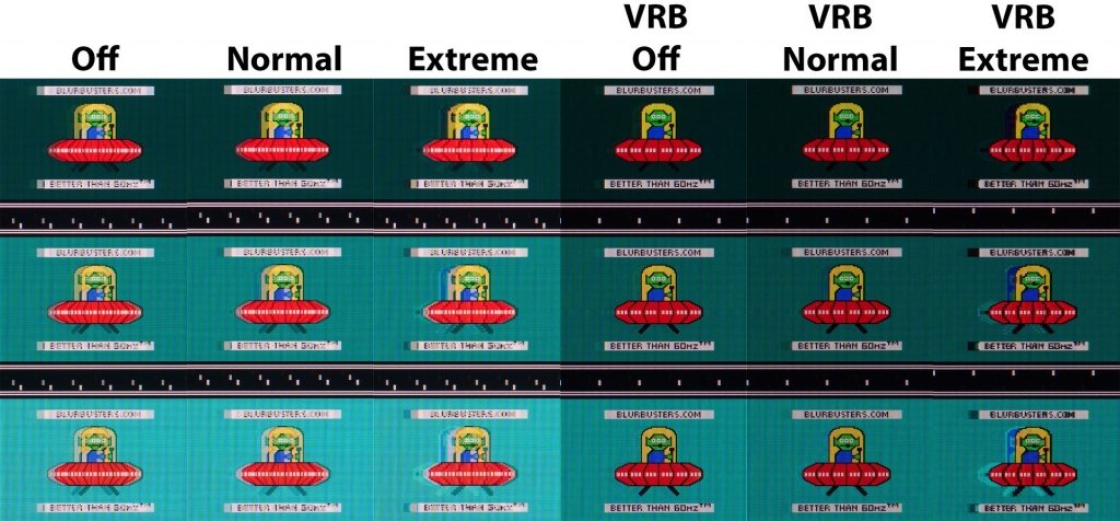 Для любителей максимальной чёткости (как на CRT) производитель добавил режим со вставкой «чёрного кадра» VRB в двух мало отличающихся друг от друга вариантах. Яркость в каждом из них резко снижается, скважность подсветки высокая, а работа предусмотрена только на частоте 100-120 Гц.