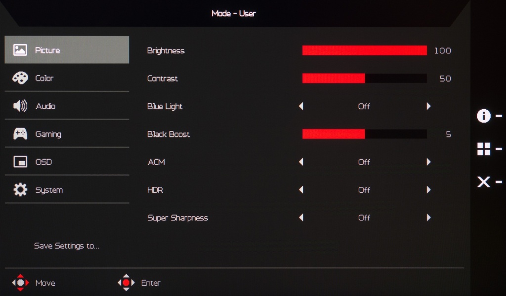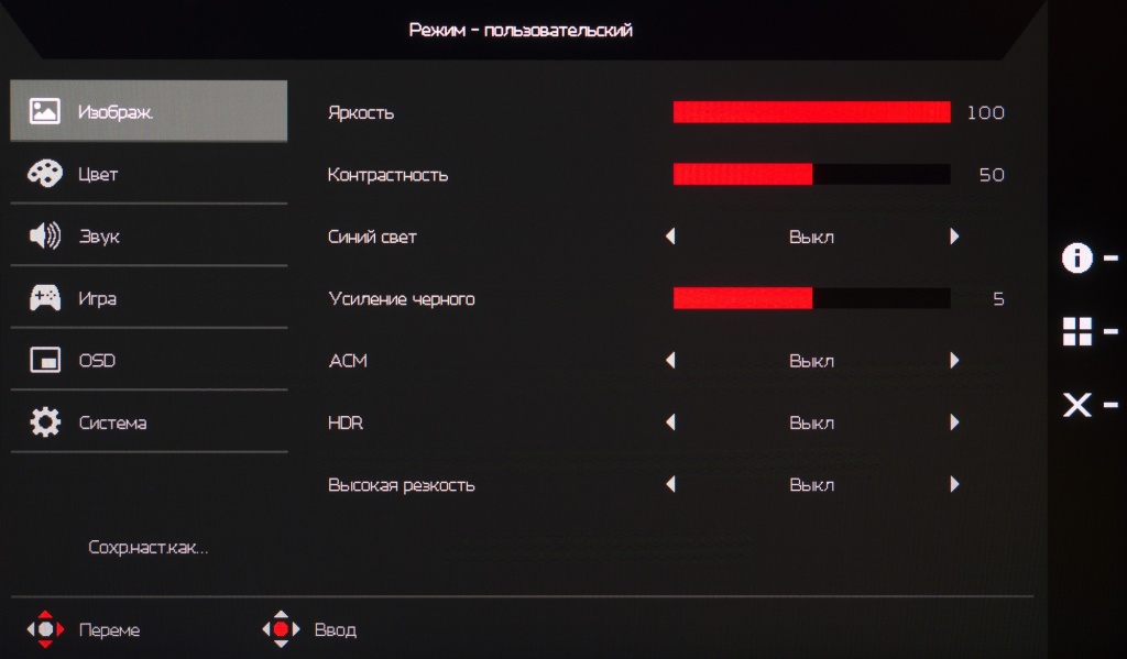У монитора Acer нет каких-либо встроенных датчиков (освещенности, приближения), но в меню есть достаточно большое количество дополнительных параметров, напрямую влияющих на точность цветопередачи и качество картинки в целом. Для оценки их влияния мы выбрали два основных: Gamma и Black Boost.
