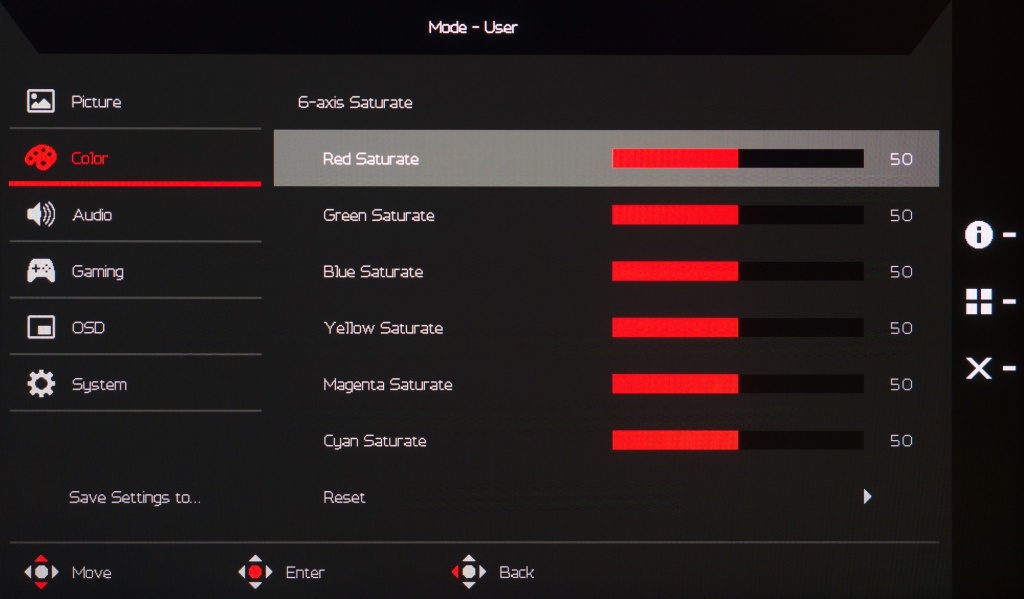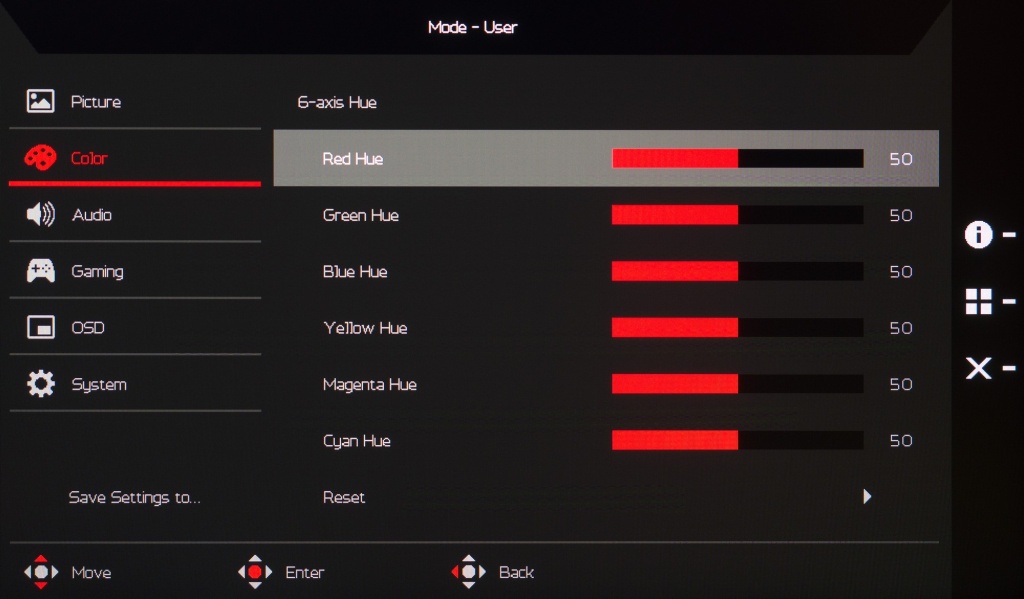 Второй раздел «Color» содержит настройки гаммы, цветовой температуры (четыре предустановки + ручной пресет), регулировки RGB по нескольким параметрам и, конечно, почти бесполезные для игрового дисплея 6-осевые коррекции по оттенку и насыщенности. Доступна активация чёрно-белого режима и выбор цветового пространства (представлены основные, в том числе рабочая эмуляция sRGB).
