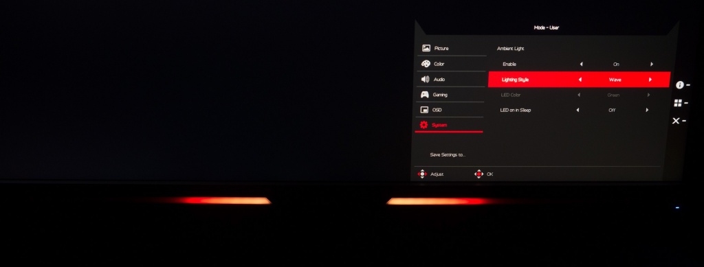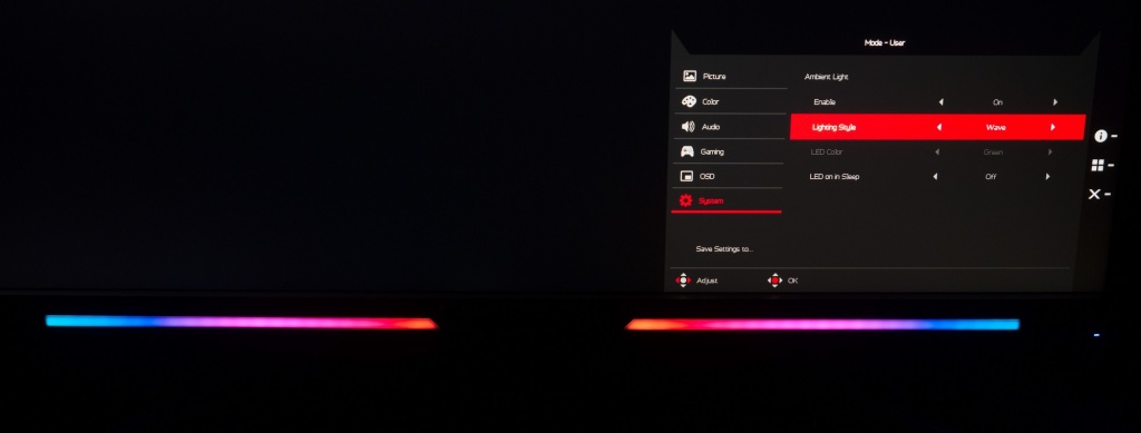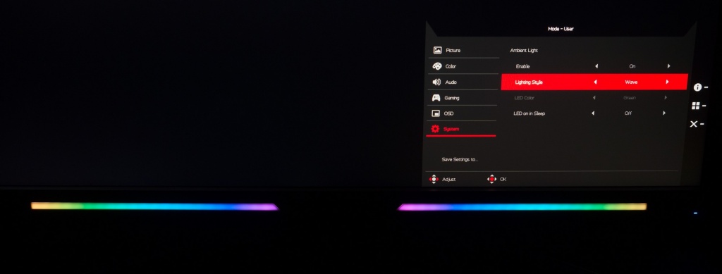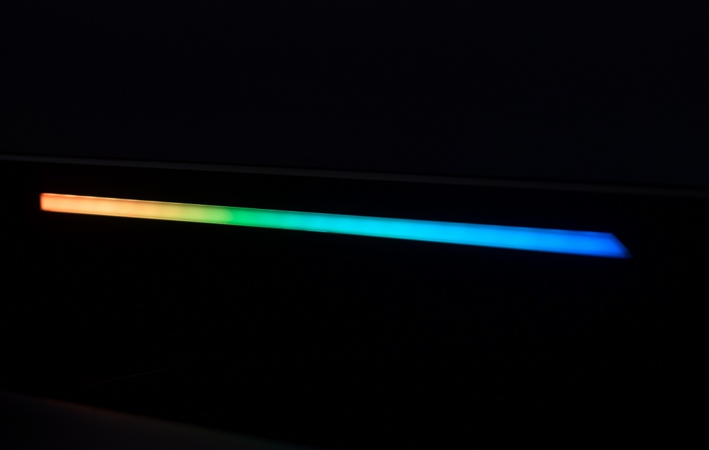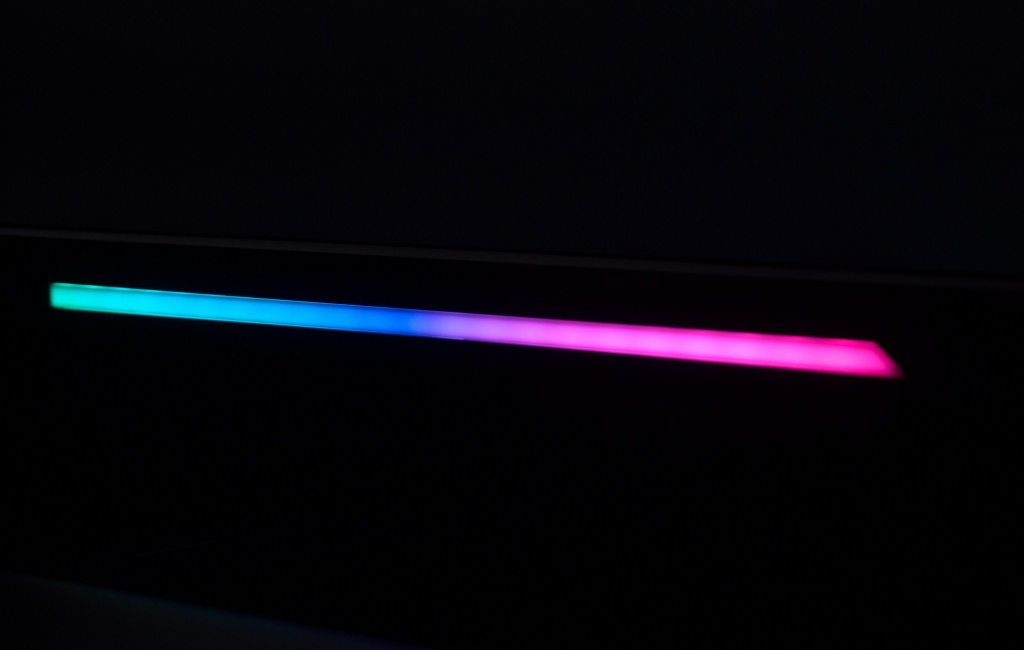 По умолчанию производитель активировал постоянный режим изменения цвета подсветки по типу радуги. Обе полосы переливаются возможными цветами. Через встроенное OSD-меню пользователь может активировать два других режима (фиксированный цвет и эффект «дыхания»), однако, для них доступен выбор исключительно из трёх цветов: красный, зелёный, синий. Тем кому не нравится подобная «новогодняя ёлка» с легкостью могут отключить данную систему.