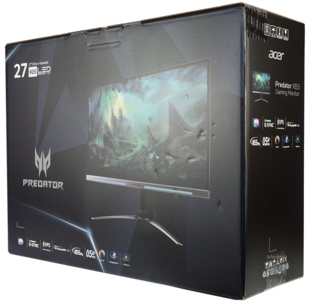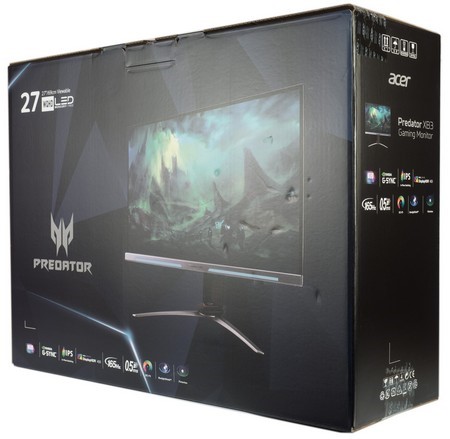 С двух сторон упаковки представлены фотографии монитора, логотипы компании, упомянута серия Predator, относящаяся к игровой линейке, а также девять пиктограмм, рассказывающих нам об особенностях модели.
