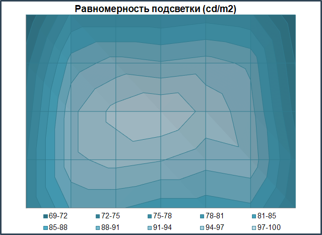 По представленной диаграмме поверхности можно наглядно увидеть, как сосредоточен уровень яркости по полю матрицы. Тут всё просто – чем дальше от центра, тем темнее и никаких вам исключений, как у некоторых других мониторов с иной зависимостью яркости от точки на экране. Более-менее равномерная подсветка отмечена лишь возле центра экрана.