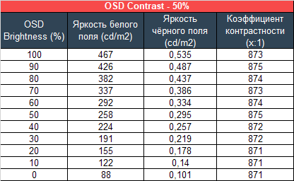 Для изучения стабильности контрастности и диапазона изменения яркости был выставлен стандартный режим. Значение Brightness менялось с 100 до 0% с шагом в 10 единиц. Для представленной ниже таблицы измеренные значения были получены через программу HCFR, которая даёт возможность более точно оценить уровень чёрного (три знака после запятой) и соответственно определить достоверный коэффициент контрастности.
