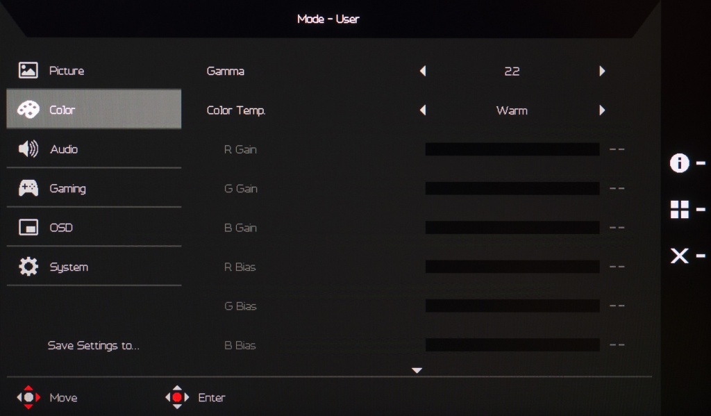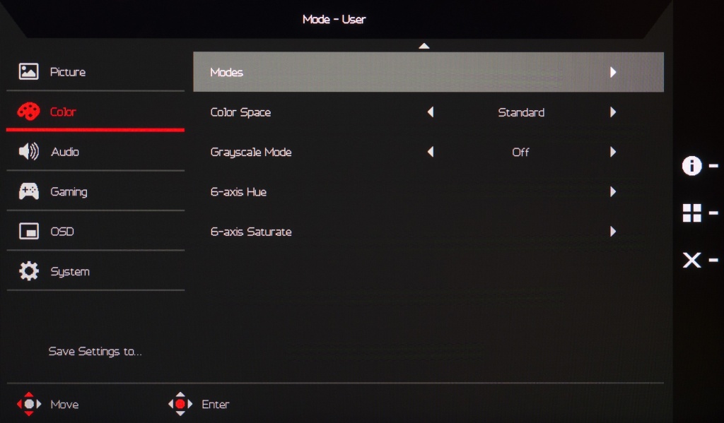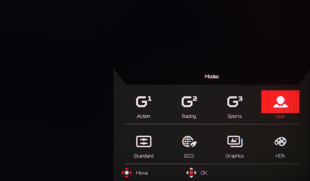 В новинке от Acer предустановлено семь основных режимов eColor, дополненных пресетом для отображения только серых оттенков (перевода картинки в режим black and white), режимом HDR и возможностью выбора одного из многих цветовых пространств (стандартов). При любых правках основных рабочих параметров монитор автоматически переходит в режим User (Пользовательский), что стоит учитывать при проведении настройки.