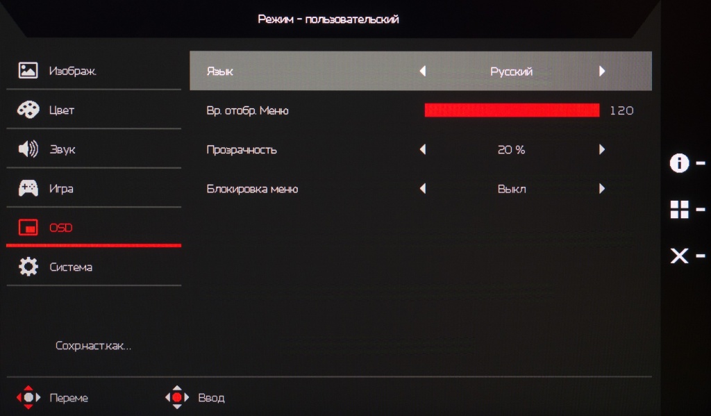 Пятый раздел «OSD» предлагает пользователю выбрать язык локализации меню (русский присутствует, но перевод, как и предполагалось, не самый полный и точный), настроить время его отображения на экране, прозрачность и заблокировать OSD-экран.