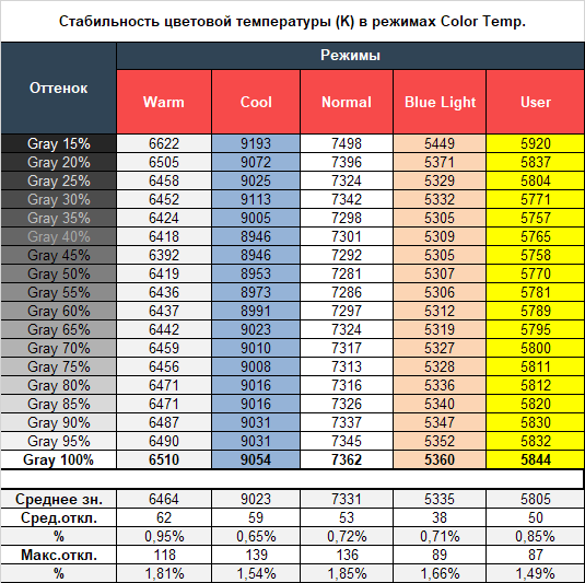 Теперь рассмотрим результаты специальных режимов Color Temp. Напомним, что по умолчанию производитель установил пресет “Warm”. Стоит учитывать, что значения его столбца полностью совпадают с результатами режима Standard из первой таблицы данного подраздела тестирования. Остаётся лишь поговорить про три оставшихся «режима» ЦТ и специальный режим Blue Light (Blue Light Filter):