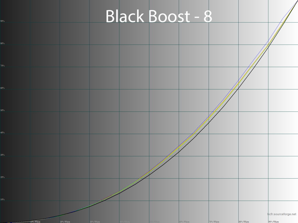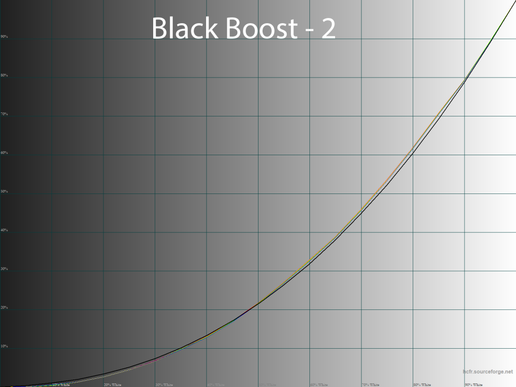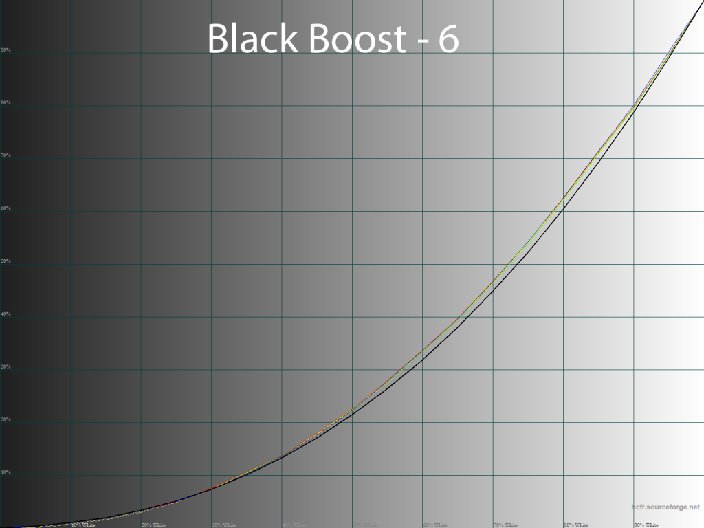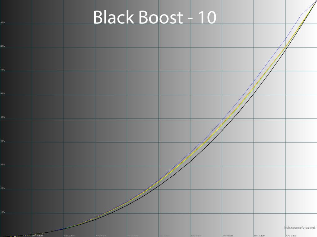 Параметр Black Boost, как следует из его названия, высветляет тени и делает это очень плавно, но, между тем, немного затрагивает и все остальные тона, что может негативно сказаться на общей точности цветопередачи. В основном это происходит свыше значения 5, а при снижении цифры разница в сравнении с заводским значением оказывается не очень выраженной.