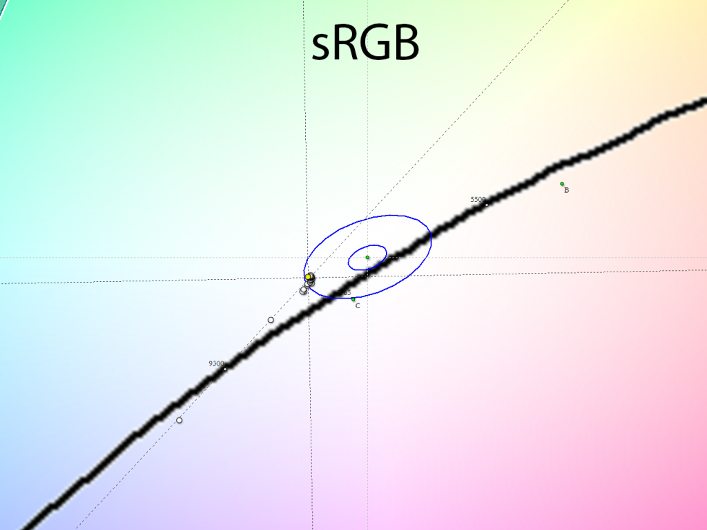 Теперь посмотрим на один из многих режимов эмуляции - наиболее полезный для многих sRGB. В нём инженеры установили яркость на уровне в 30 % и выставили гамма-кривые практически в соответствии с необходимым стандартом. Получилось близко к идеалу, особенно в области с крайними тенями, да и цветовой охват действительно сужается до необходимых величин, однако, точка белого сразу улетает к DeltaE на уровень почти в 5 единиц, но зато с сохранением высокой стабильности ЦТ оттенков серого. Увы, настроить точку белого вручную в этом пресете нельзя, но отрегулировать яркость – это пожалуйста – пользуйтесь на здоровье.
