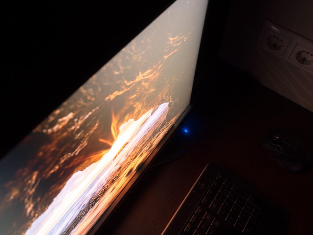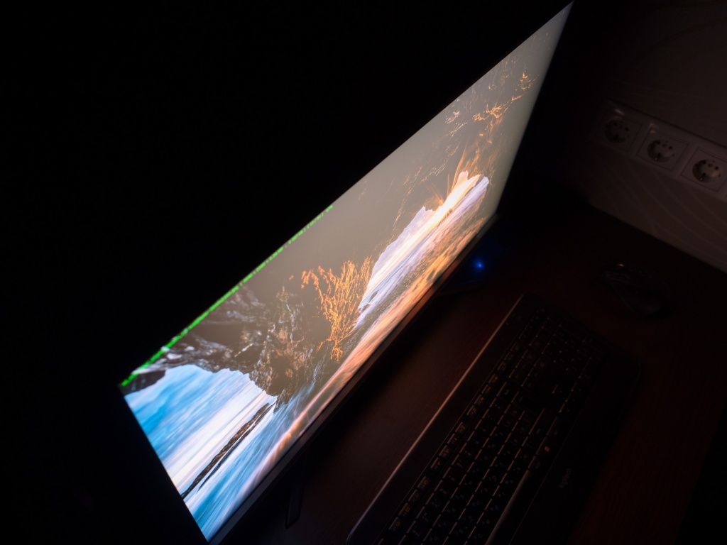 При сильном отдалении от экрана Glow полностью исчезает, и мы становимся свидетелями практически идеально равномерного чёрного поля на 70 % площади экрана и яркими засветами в уже отмеченных углах справа. Именно они вносят свою лепту в усиление Glow-эффекта при близком расположении к монитору, а поэтому при возможности лучше подобрать экземпляр без подобных дефектов подсветки.