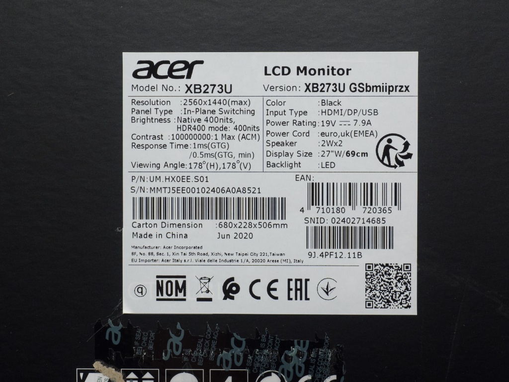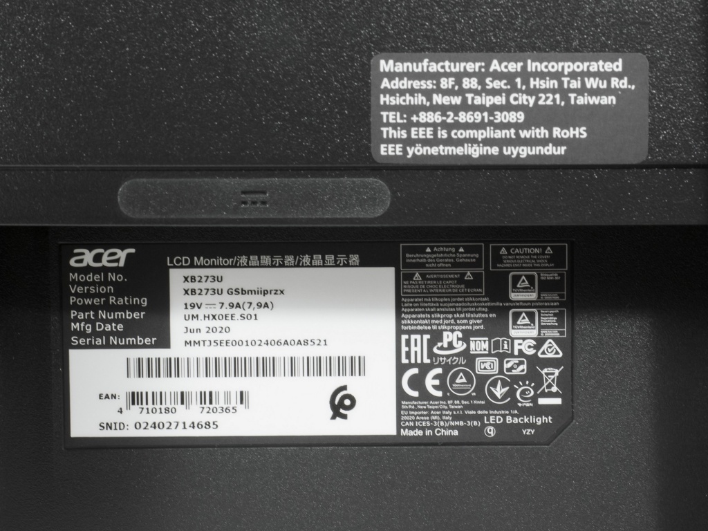 По одной из наклеек можно узнать основные технические характеристики продукта, место (Китай) и ориентировочную дату (июнь 2020 года) сборки нашего экземпляра. Монитор производится непосредственно силами самой компании Acer, без привлечения сторонних подрядчиков (не считая производителя матрицы).