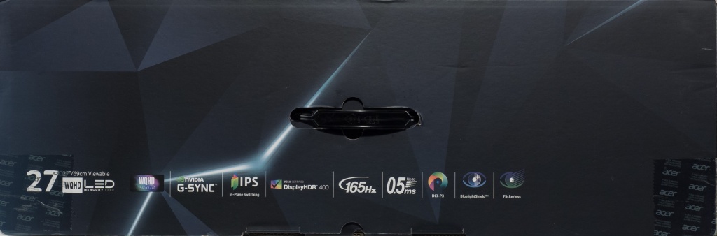 Монитор Acer поставляется в небольшой, но красиво оформленной коробке с качественной полиграфией. Используется более тёмное цветовое оформление, чем в случае с линейкой Nitro. Для удобства переноски есть пластиковая ручка сверху и два специальных выреза в самой коробке.