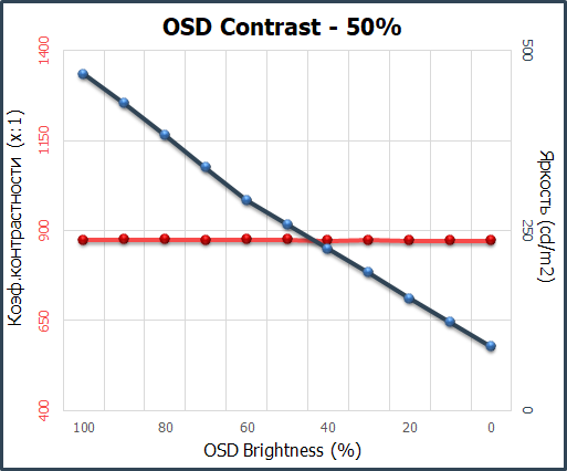 При стандартных установках полученный рабочий диапазон яркости составил 88-467 нит при среднем коэффициенте контрастности в ~873:1. Снижение яркости практически линейно, а контрастность стабильна во всём диапазоне и в среднем на 13 % ниже заявленного производителем уровня.