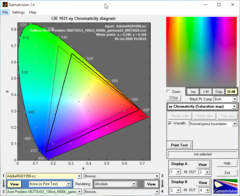 После настройки монитора на яркость в 100-102 нит мы получили коэффициент контрастности почти в 900:1, идеальную точку белого и минимальные отклонения DeltaE94 в 0,25 в среднем и 0,9 в максимуме – отличный результат. Можно двигаться дальше.