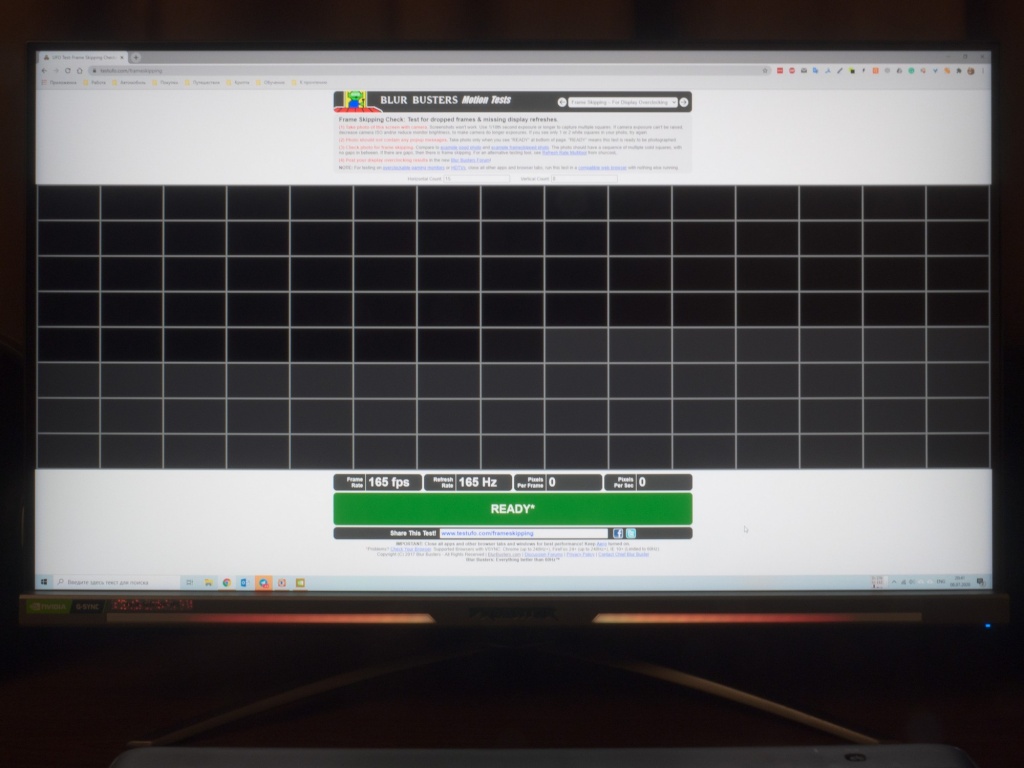 Отсутствие же пропуска кадров при максимальной заявленной частоте вертикальной развёртки в 165 Гц было подтверждено с помощью специального теста из пакета TestUFO. Проблем у монитора в этом вопросе нет.