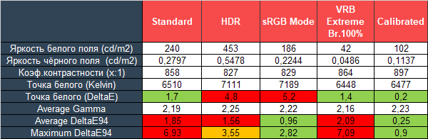 Коэффициент контрастности во всех изученных режимах оказался несколько ниже заявленного, но ничего страшного из-за этого не произошло. О достаточно хорошей настройке точки белого можно говорить в режимах Standard и VRB Extreme. А вот при сравнении со стандартом sRGB наиболее высокую точность цветопередачи смог продемонстрировать только соответствующий режим, но по White Point не всё так хорошо, как хотелось бы.