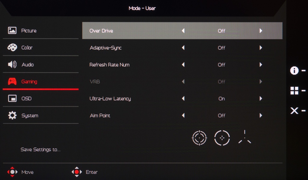 В раздел «Gaming» производитель вынес настройки разгона панели (Over Drive), включение технологии Adaptive-Sync, режим «вставки чёрного кадра» VRB, выбор наэкранного прицела и отображение частоты обновления. Добавлена функция снижения инпут-лага, которая активирована по умолчанию. Отдельно отметим, что при активации Adaptive-Sync (необходимо для работы Free-Sync и G-Sync Compatible) возможность регулировки Over Drive блокируется!