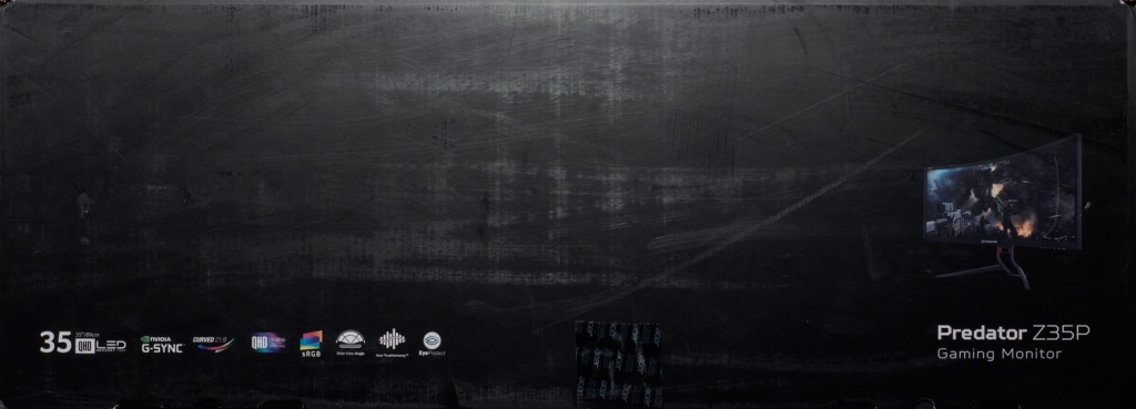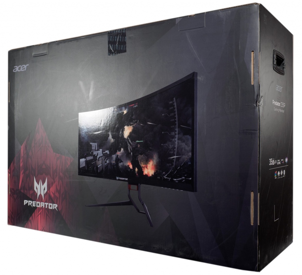 Монитор Acer поставляется в просто огромной картонной коробке с качественной полиграфией. Дизайн упаковки выполнен в «игровом стиле» (стандартные чёрно-красные тона) и знаком нам по другим моделям серии Predator.