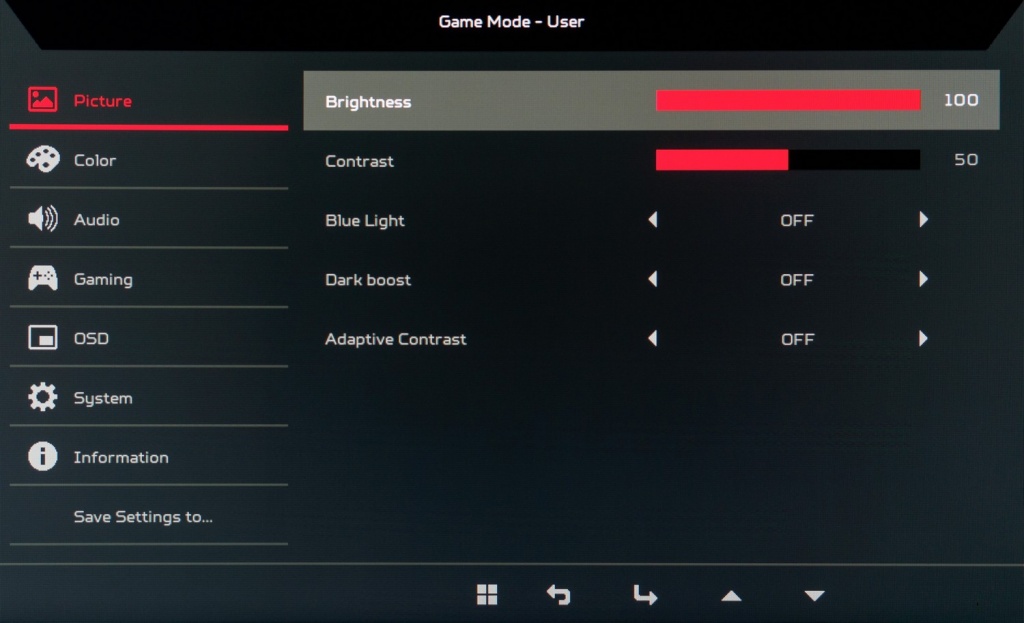 Первый «Picture» предоставляет доступ к настройкам яркости, контраста, фильтру Blue Light, функции улучшения различимости крайних тёмных оттенков (Dark boost) и активации динамической контрастности. Перейти к режимам eColor можно в любой момент, нажав на крайнюю левую клавишу управления.