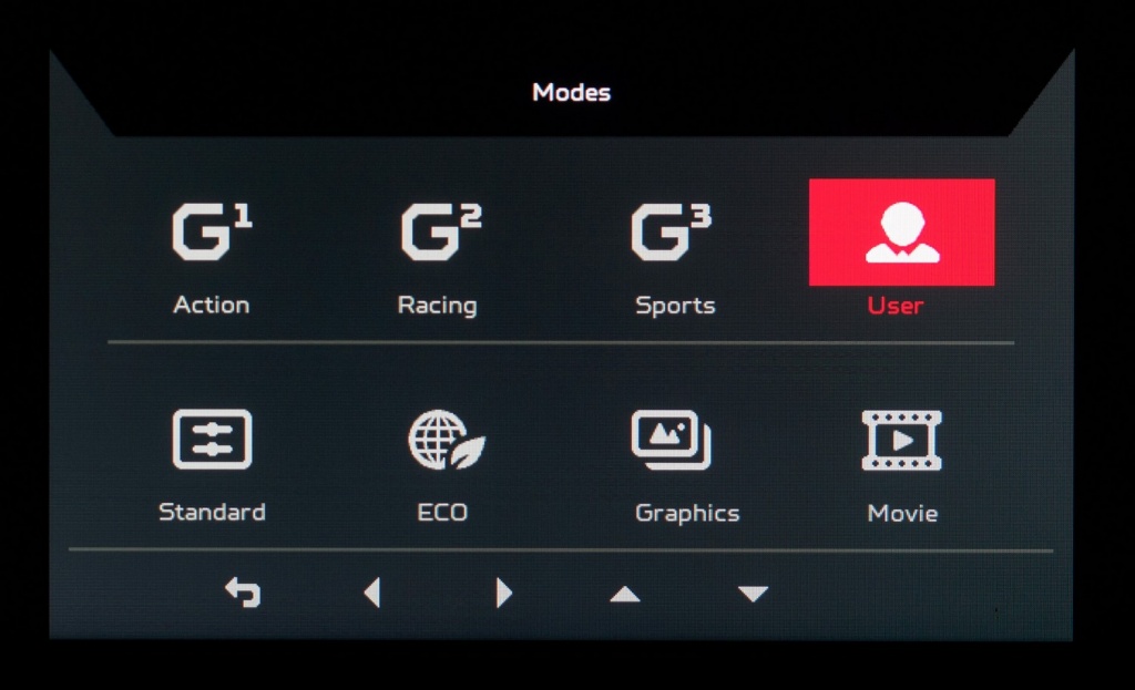 В новинке от Acer предустановленно четыре основных режима eColor, дополненных пресетом для ручных настроек и тремя игровыми режимами. При любых правках основных рабочих параметров монитор автоматически переходит в режим User (Пользовательский).