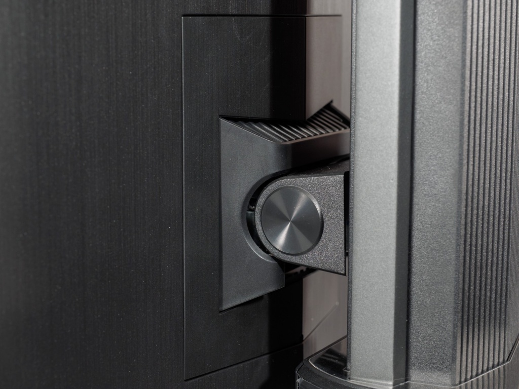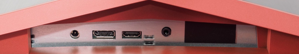 В задней части монитора расположились все основные интерфейсы для подключения, ориентированные вниз. Подключать кабели неудобно, ввиду отсутствия возможности переворота в портретный режим и нахождении колодки под пластиковым «навесом». Благо, что подключать кабели вы будете крайне редко.