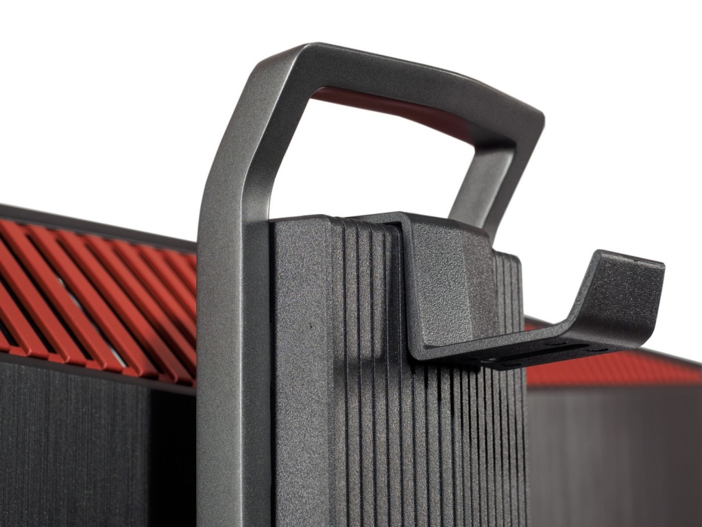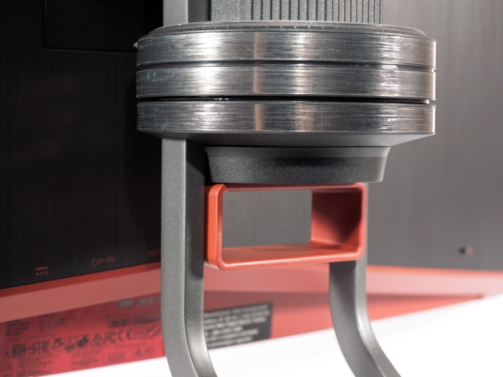 А вот металлическую ручку сверху никто забывать не планировал – она на своём законном месте. Рядом с ней можно установить пластиковый держатель для наушников, который можно найти в комплекте поставки – ещё один элемент, без которого не могут обойтись производители в своих игровых мониторах.