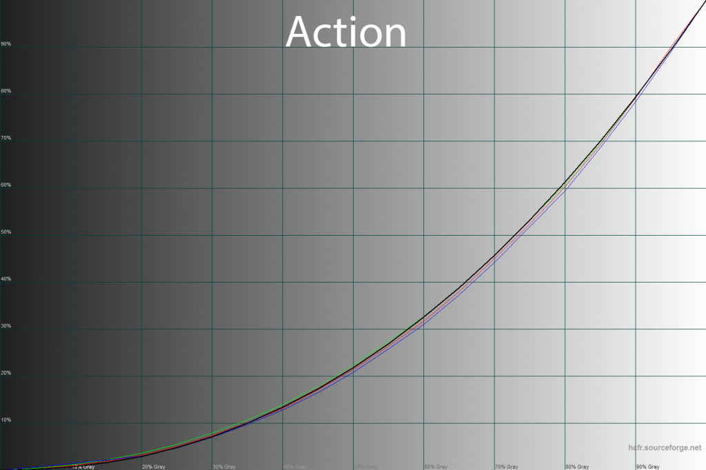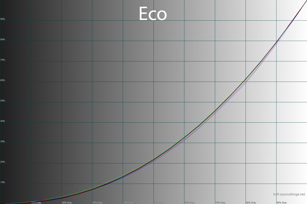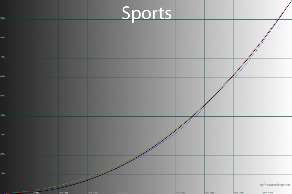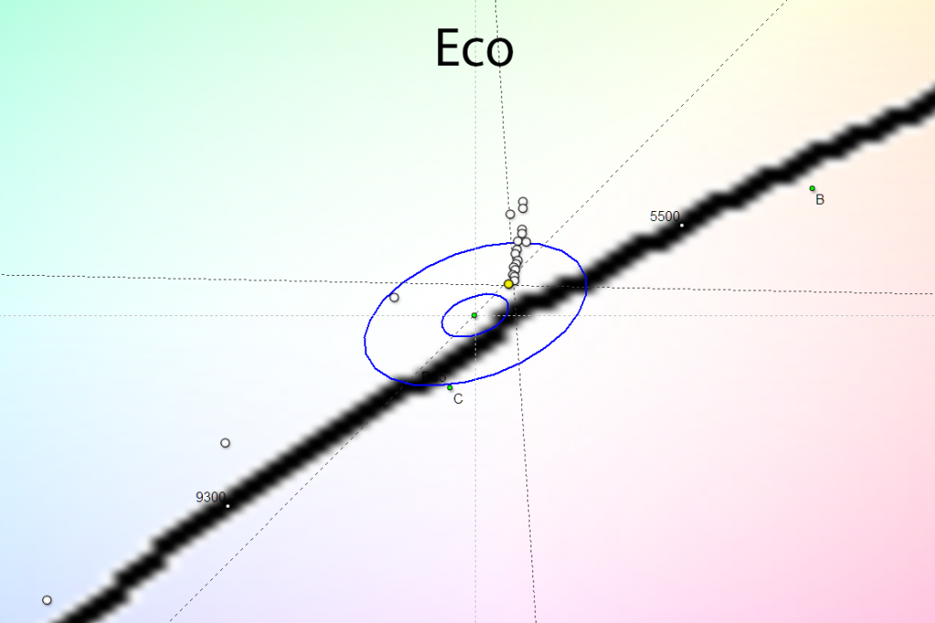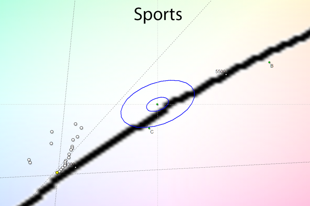 А вот по настройке точке белого – полная стабильность и средний результат во всех предустановленных режимах (за исключением всё того же Sports) с легким паразитным оттенком. Средняя по точности цветопередача в целом отмечена в трёх режимах: Standard, отличный от него по яркости Eco и Action с ещё меньшим значением Brightness.