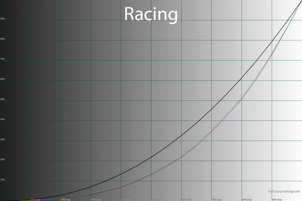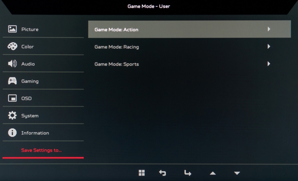 Три дополнительных игровых режима внесены в меню монитора не совсем понятно для чего. Action с включённым индикатором-счётчиком кадровой развёртки отличается от Standard и Eco только яркостью, причём более низкой. Режим Racing крайне тёмный и контрастный, а Sports больше похож на Low Blue Light, чем на что-то другое.