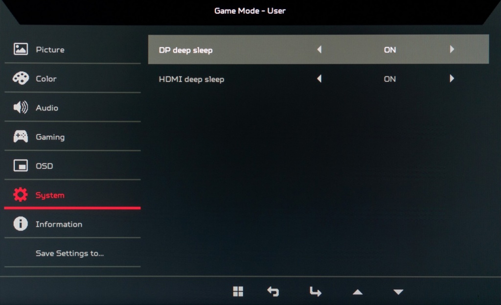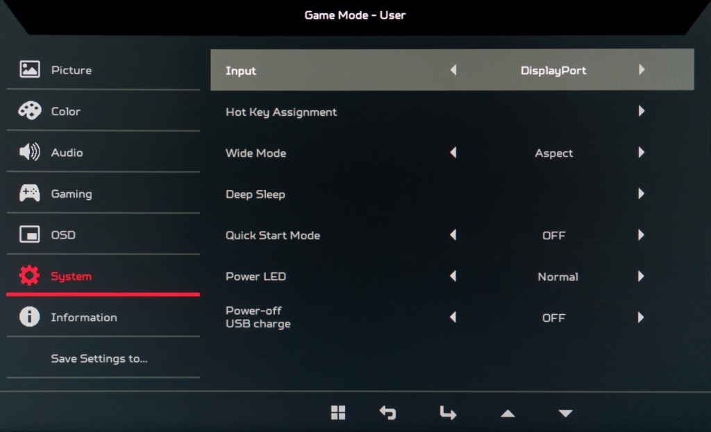Изменить режим работы встроенного скалера, включить зарядку при выключенном экране и быстрое включение, активировать глубокий сон для DP и HDMI, переназначить две функции с быстрым доступом, выбрать интерфейс подключения – всё это можно в разделе «System».