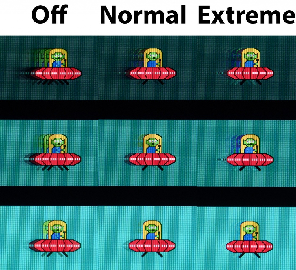 Что же касается разницы между 100 и 120 Гц, то увидеть её вы сможете только при прямом сравнении двух мониторов, подключённых к одной системе. С точки же зрения адекватности произведённого заводского разгона – Acer – молодцы. Шлейфы на светлых и средних по светлоте переходах меньше, чем у AOC, артефактов в режиме Normal мало, необходимости менять пресет OD нет. К тому же при выключении шлейфы сильно увеличиваются, мы бы даже сказали – в разы, а при активации Extreme становится слишком видны артефакты.