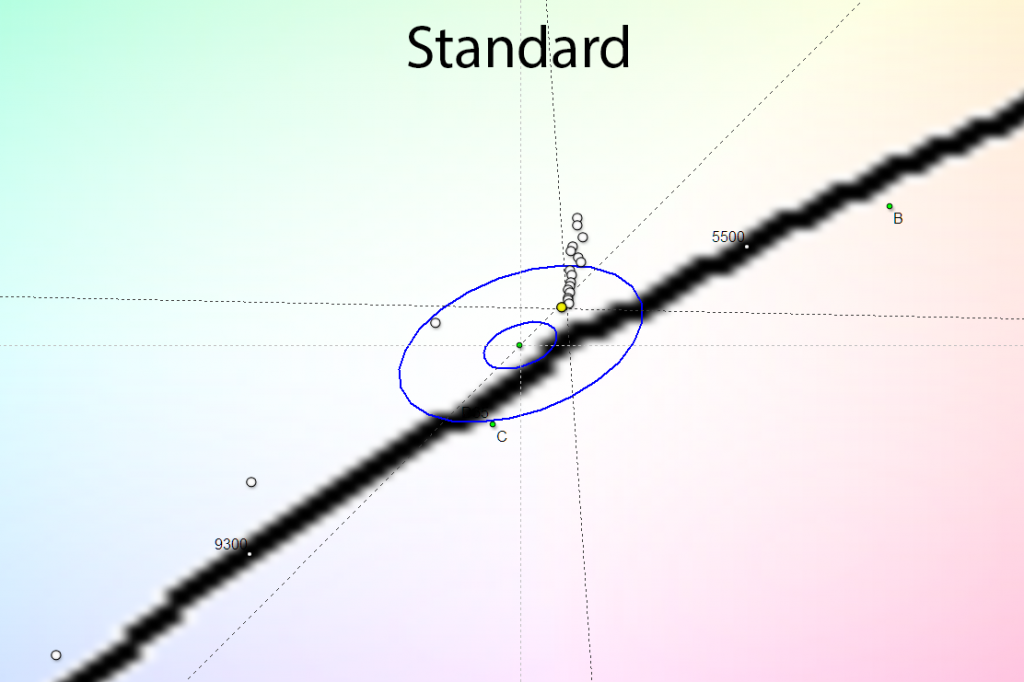 Теперь перейдём к рассмотрению равномерности цветовой температуры на всей площади экрана.