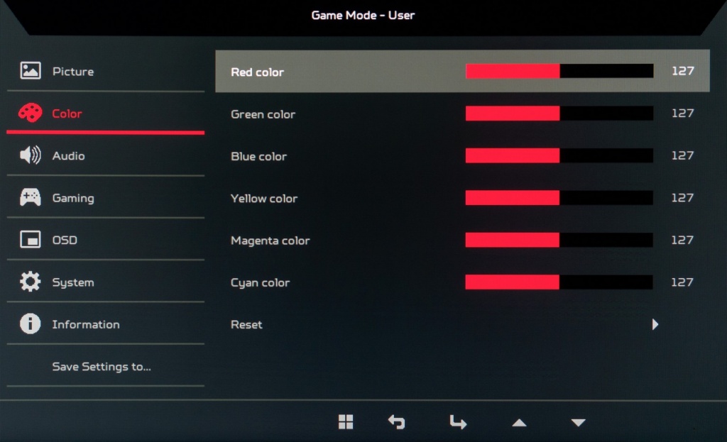 Что касается режимов Gamma, то ничего особенного производитель не предоставил. Есть лишь одно стандартное и самое оптимальное значение 2.2 и три непонятно для чего оставленных в меню: Gamma 1.9 и 2.5 и совсем непонятный Gaming с очень тёмной картинкой, без различимости в тенях и прочего – как правило для игровых режимов производители делают с точностью наоборот. Так что инженеры Acer, в этот раз, нас сильно удивили.