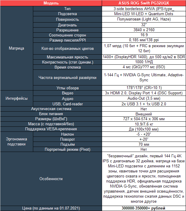 Для любителей читать только выводы - основные достоинства и недостатки ASUS ROG Swift PG32UQX в краткой форме представлены ниже.