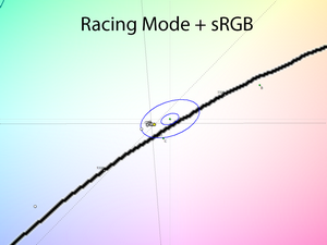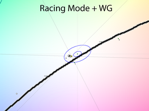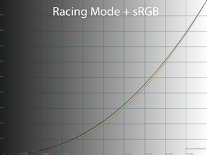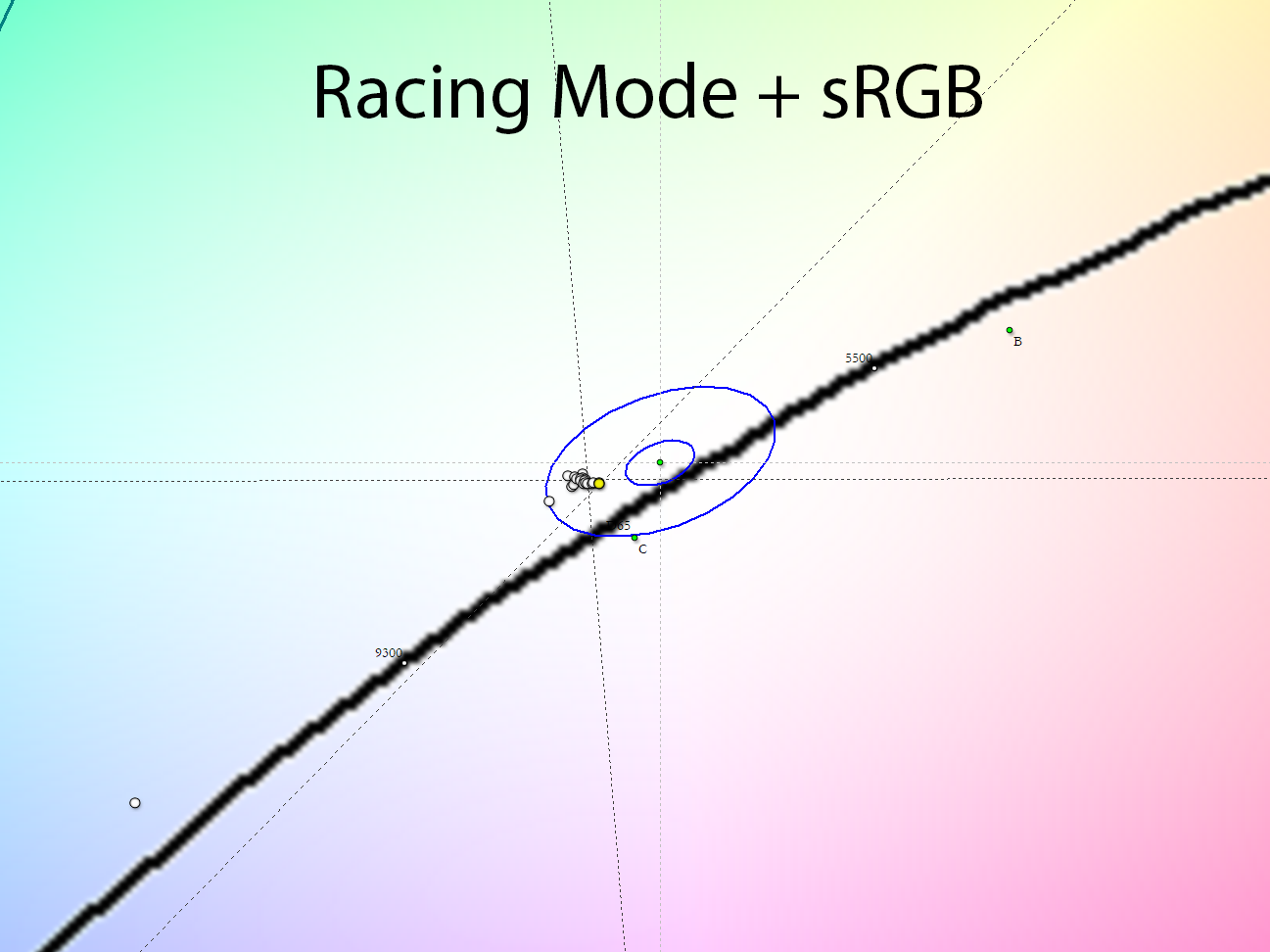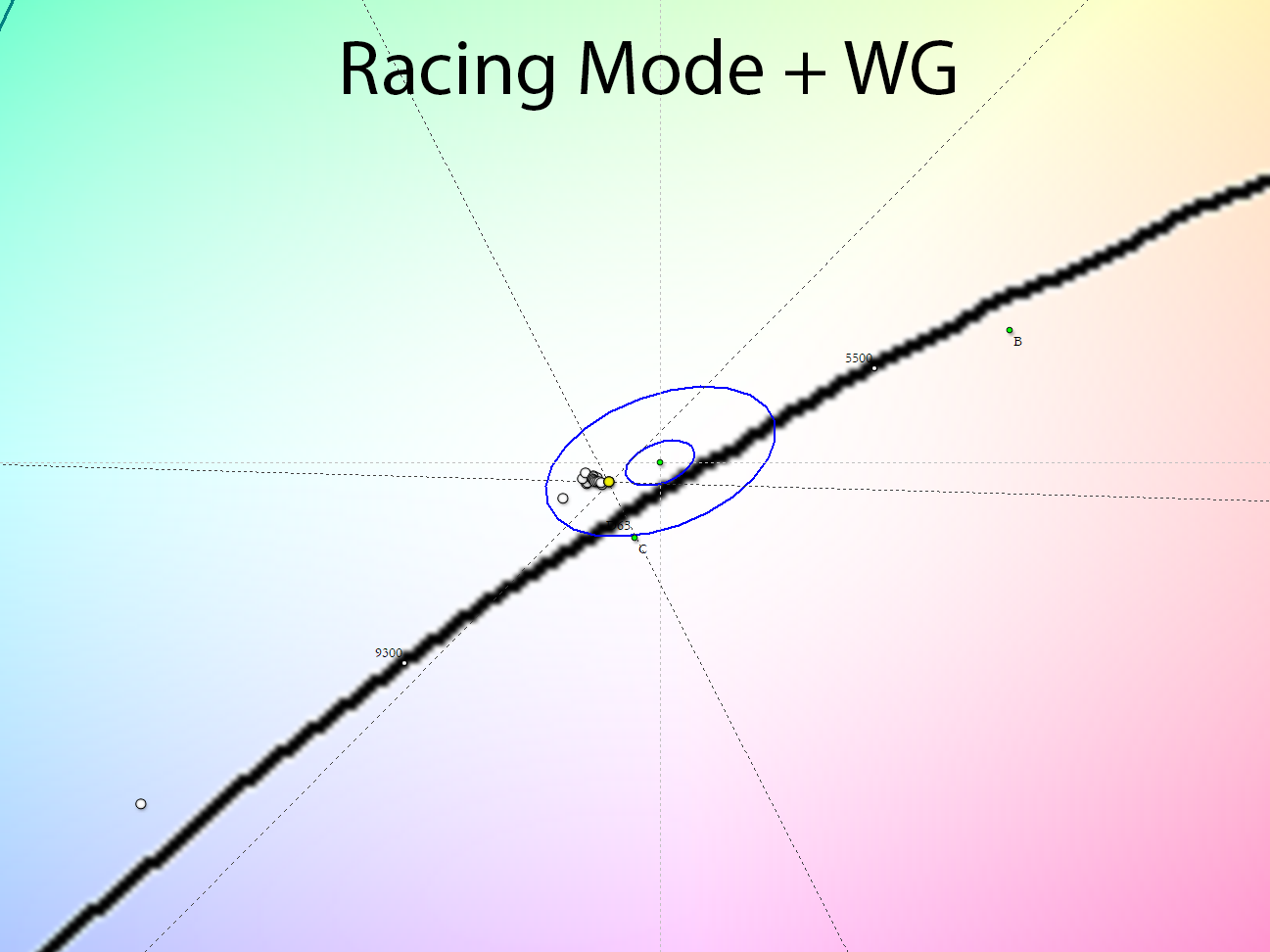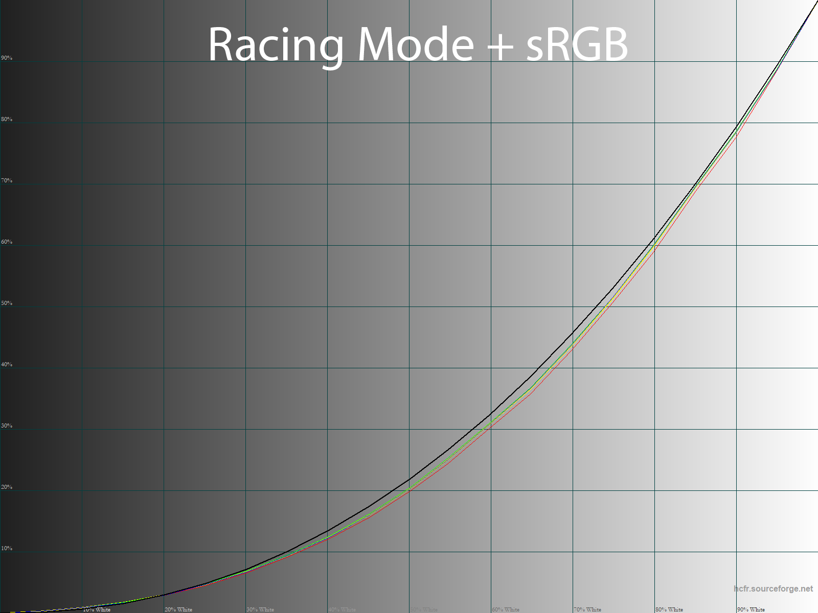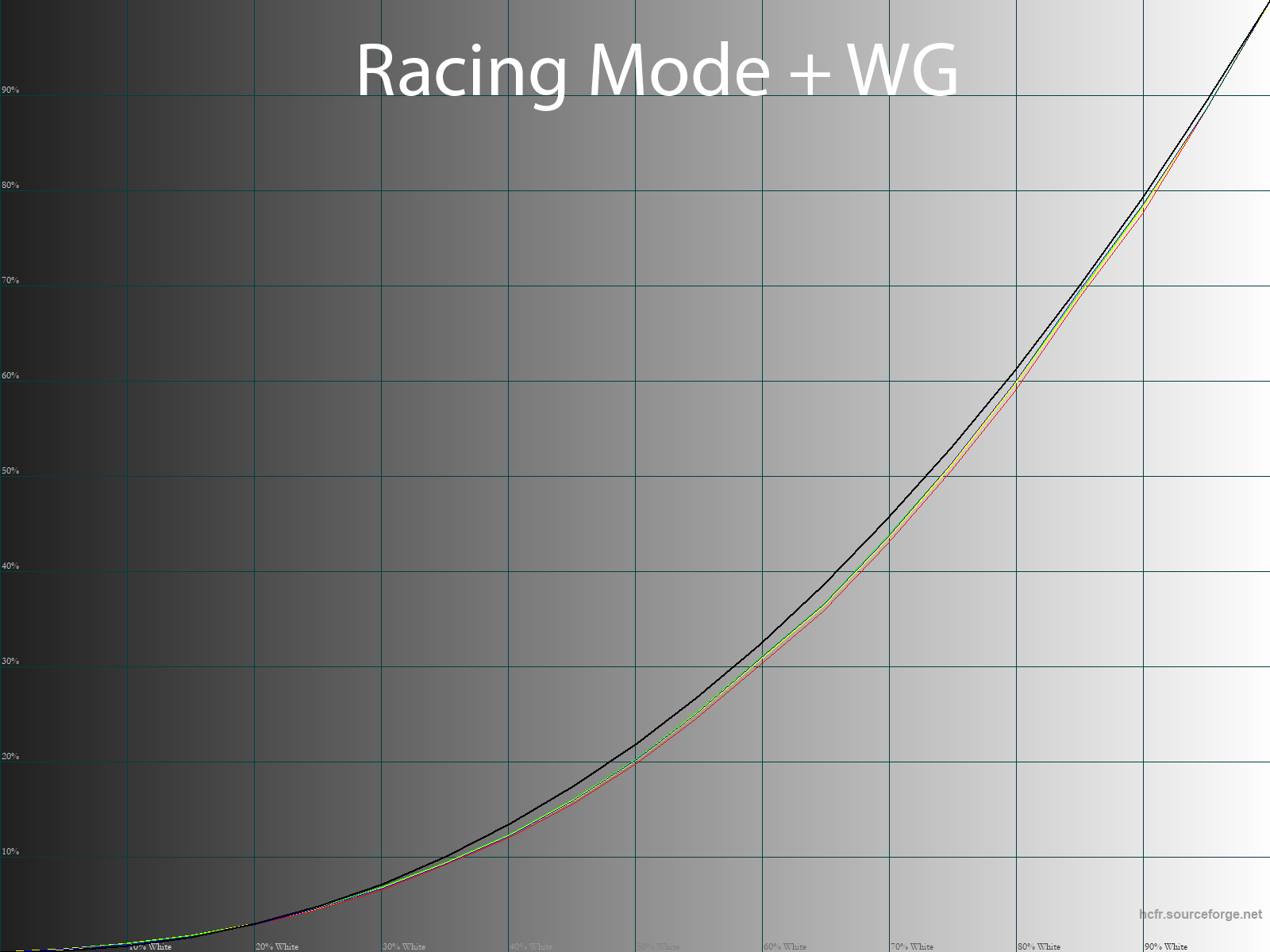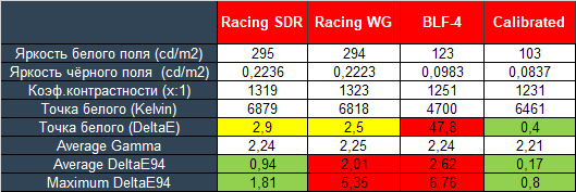 При стандартных настройках изначальная яркость завышена (для продолжительной работы), но нет никаких проблем снизить её до нужного значения, что в sRGB (SDR) варианте, что с WideGamut. Коэффициент контрастности превышает заявленный в ТХ уровень на 30-32 %, а точка белого настроена на уровне выше среднего. Особых проблем с гаммой нет, контрастность картинки близка к правильной. По общему же уровню отклонений цветопередачи лучшим, как и ожидалось, оказался режим Racing со стандартным цветовым охватом. После него идёт WideGamut с более широкими возможностями чем взятое за референс пространство AdobeRGB, а закрывает рейтинг BLF-4 с адекватным уровнем яркости, чуть меньшим коэффициентом контрастности и точкой белого на уровне «тёплых» 4700К с паразитным оттенком.