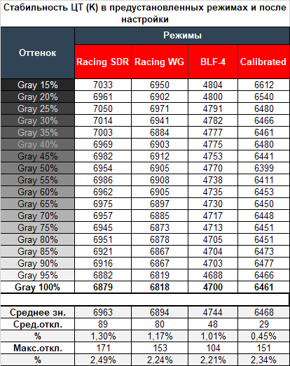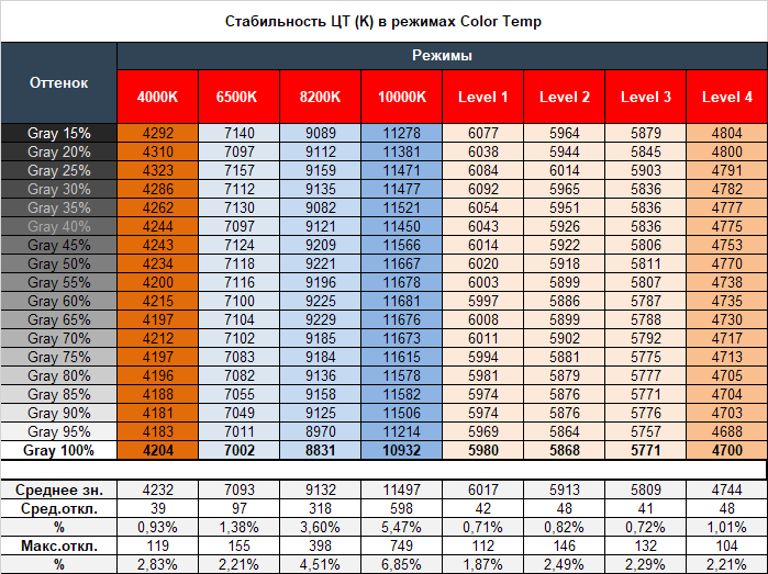 Уровень стабильности цветовой температуры оказался высоким. Разница между изученными режимами практически отсутствует. Проведённая калибровка позволила в 2-3 раза снизить среднее отклонение, но на глаз заметить эту разницу, учитывая изначальный уровень настройки, будет практически невозможно.
