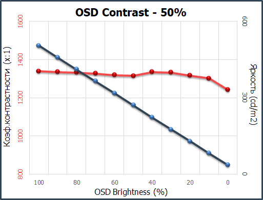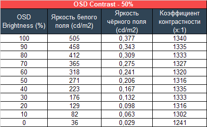 Для изучения стабильности контрастности и диапазона изменения яркости был выставлен режим Racing. Значение Brightness менялось с 100 до 0% с шагом в 10 единиц. Для представленной ниже таблицы измеренные значения были получены через программу HCFR, которая даёт возможность более точно оценить уровень чёрного (три знака после запятой) и соответственно определить достоверный коэффициент контрастности.