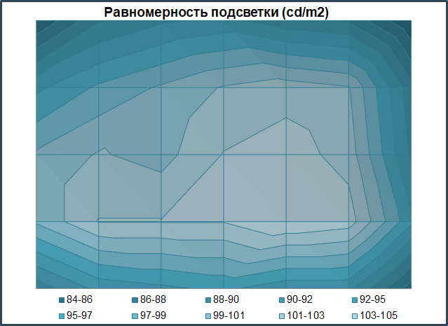 По представленной диаграмме поверхности можно наглядно увидеть, как сосредоточен уровень яркости по полю матрицы. У нашего экземпляра больше всего затемнены углы панели, верхний и нижний края матрицы. Впрочем, разница в сравнении с яркостью в центральной точке не большая, а поэтому дискомфорта в реальной работе данные особенности не вызывают.