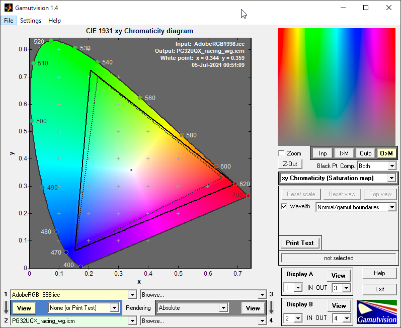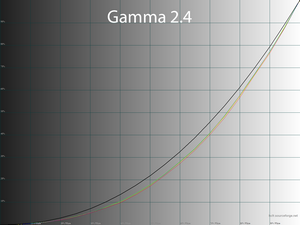 Первоначальная проверка осуществлялась при заводских настройках дисплея, для которых производитель определил эмуляцию стандартного цветового пространства sRGB. В этом случае монитор максимально точно описывает данный стандарт и не превосходит его. При переключении в режим WideGamut (расширенный охват) электроника выключает какие-либо эмуляции и демонстрирует все возможности установленной панели. В таком состоянии монитор превосходит пространство AdobeRGB на зелёных и красных участках и достаточно точно (на уровне 93-95 %) повторяет DCI-P3.