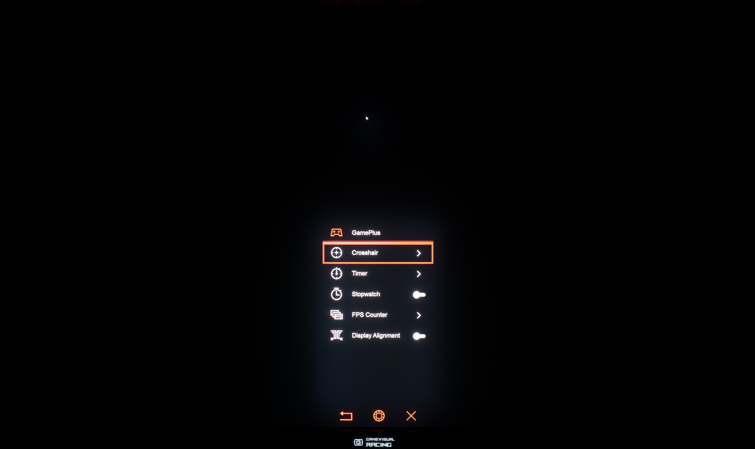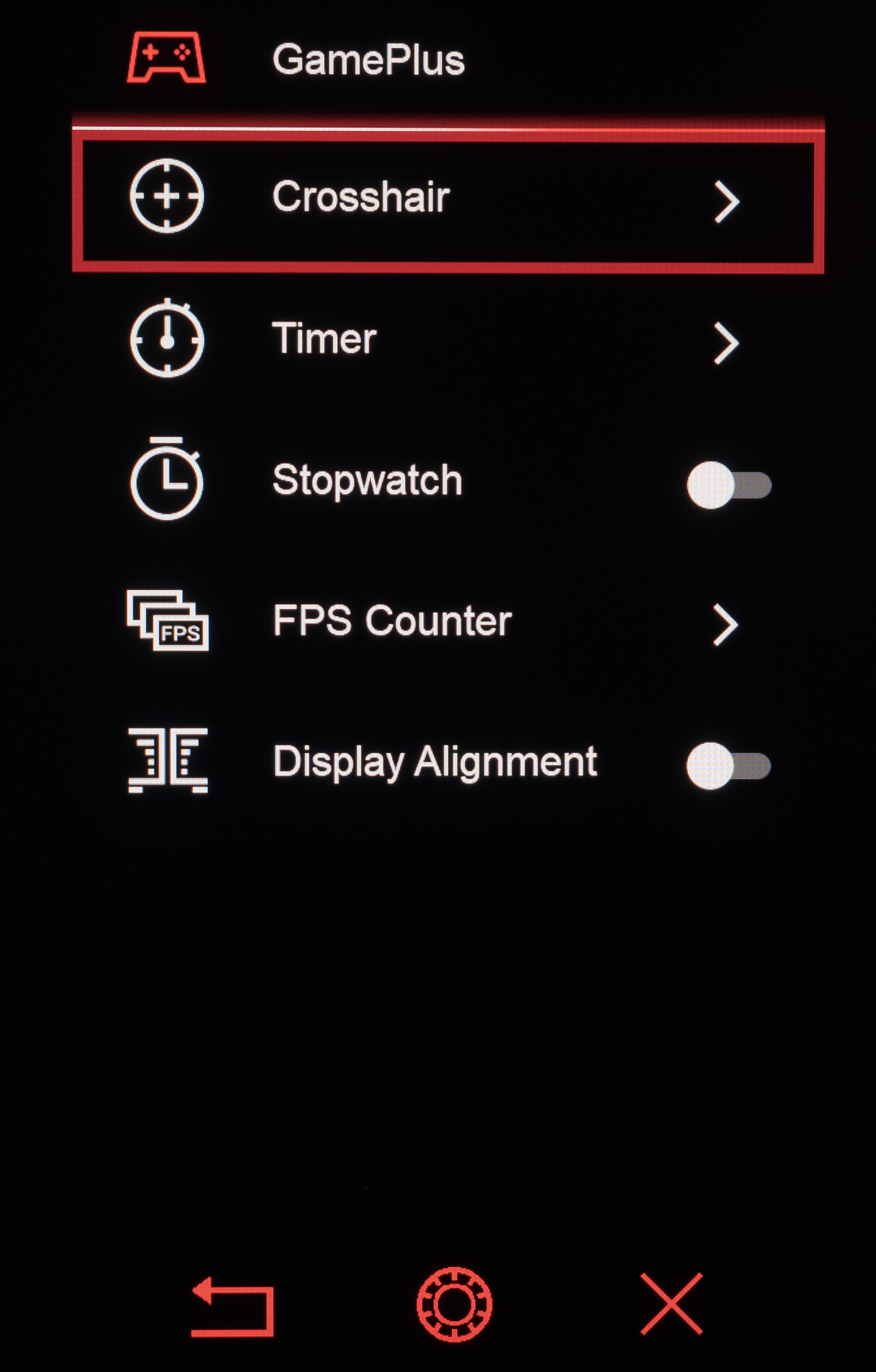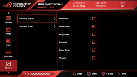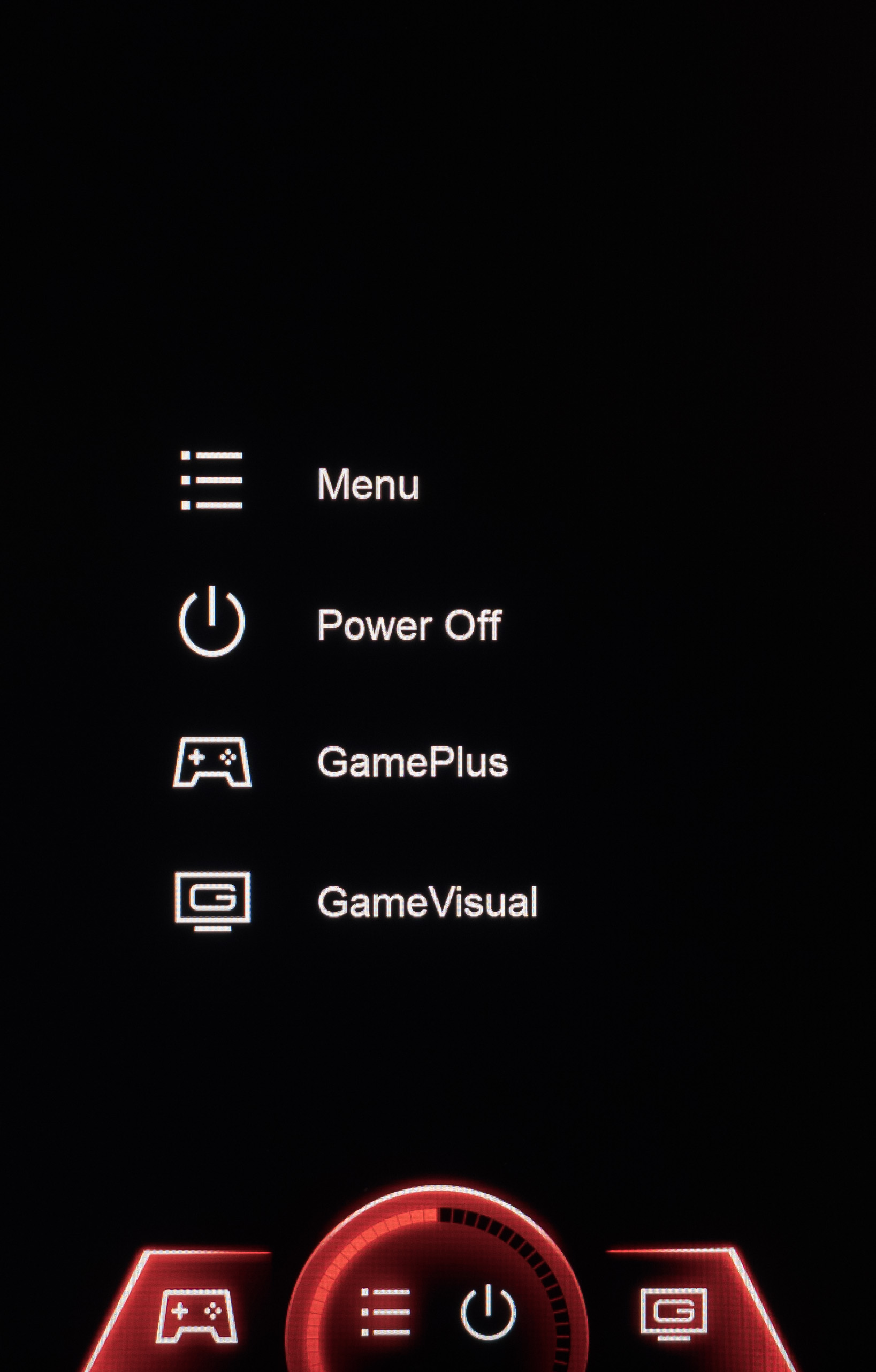 Центральная клавиша управления отвечает за включение/выключение монитора и выбор, другая является кнопкой отмены или выхода из раздела и совмещает в себе возможность для активации функции с быстрым доступом в дополнение к правой кнопке. Обе могут быть перенастроены через специальный раздел меню, где будет предложено достаточно много вариантов. По умолчанию же они настроены для активации игрового таймера/настраиваемого прицела/счётчика FPS (функция GamePlus) и быстрого переключения предустановленных режимов GameVisual.
