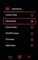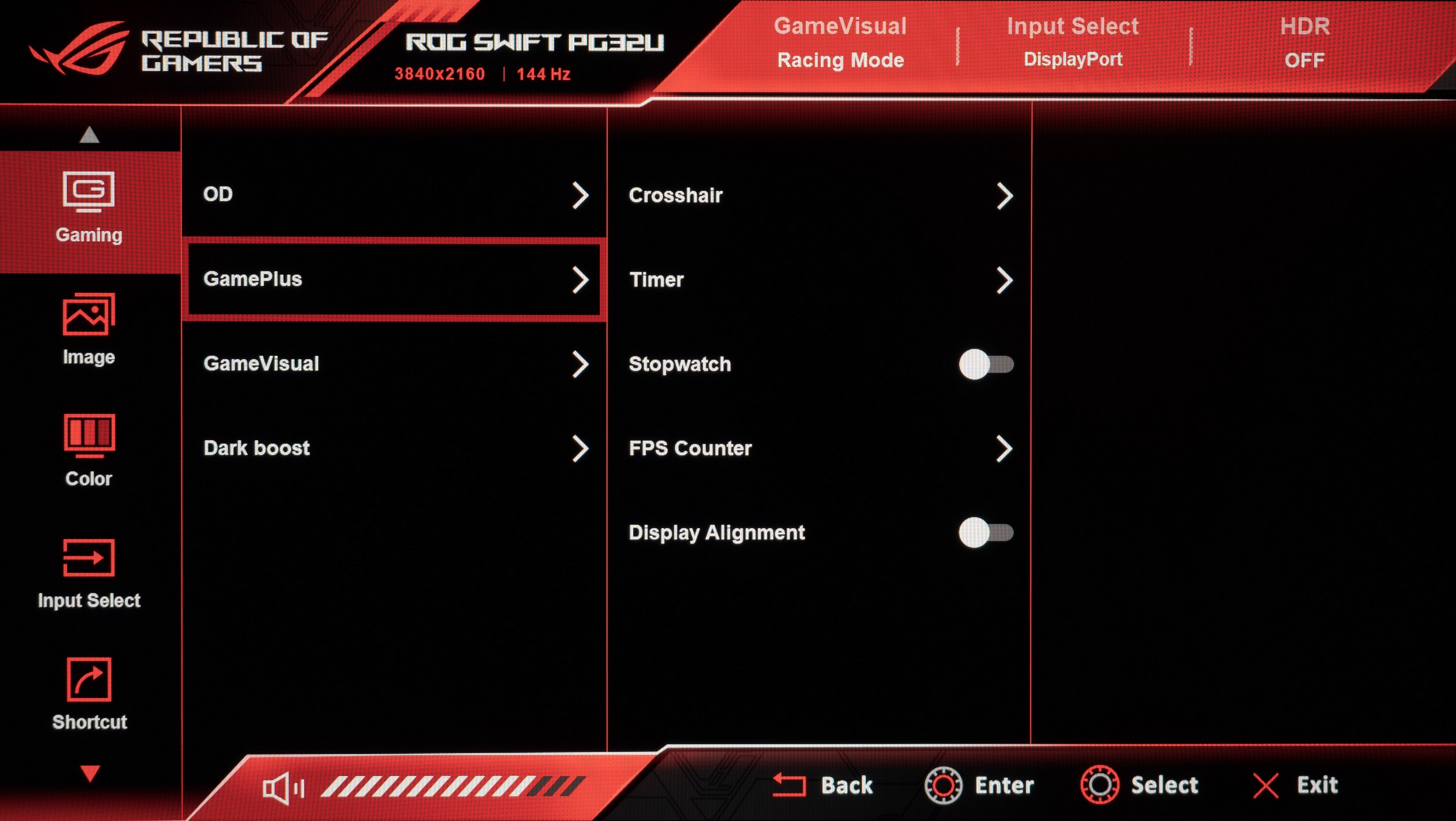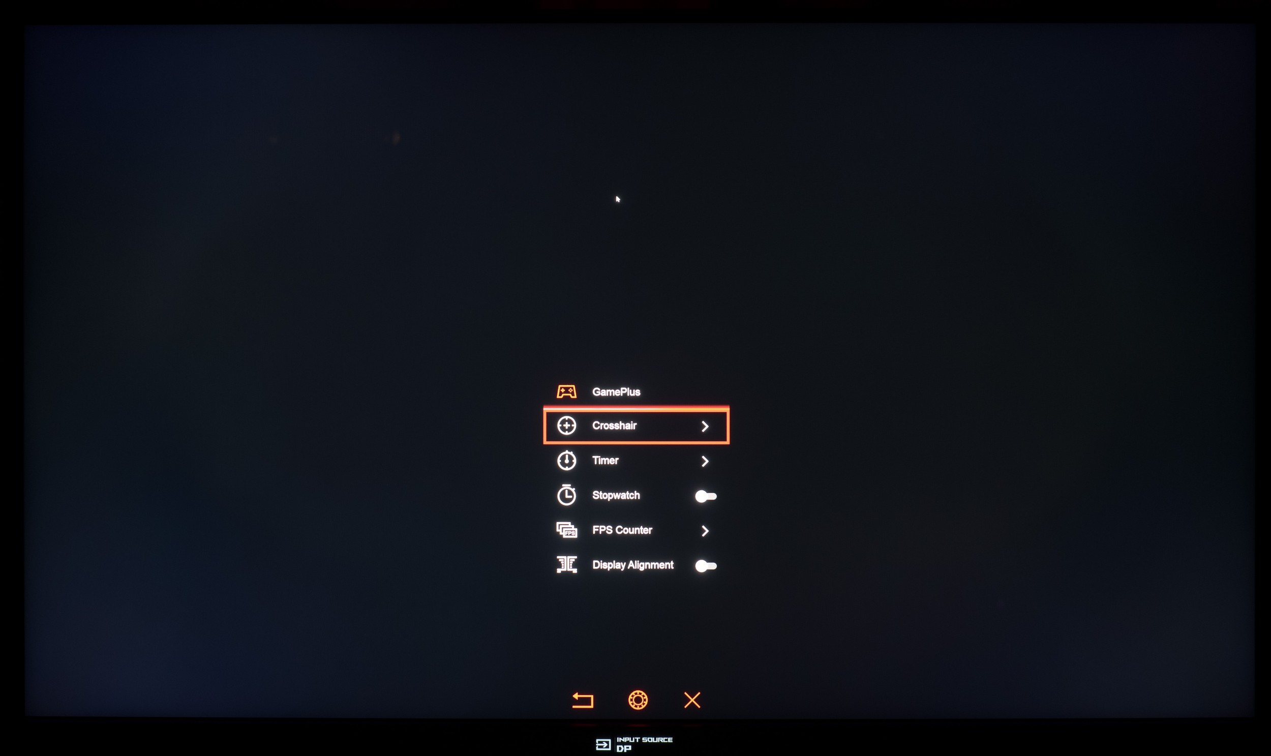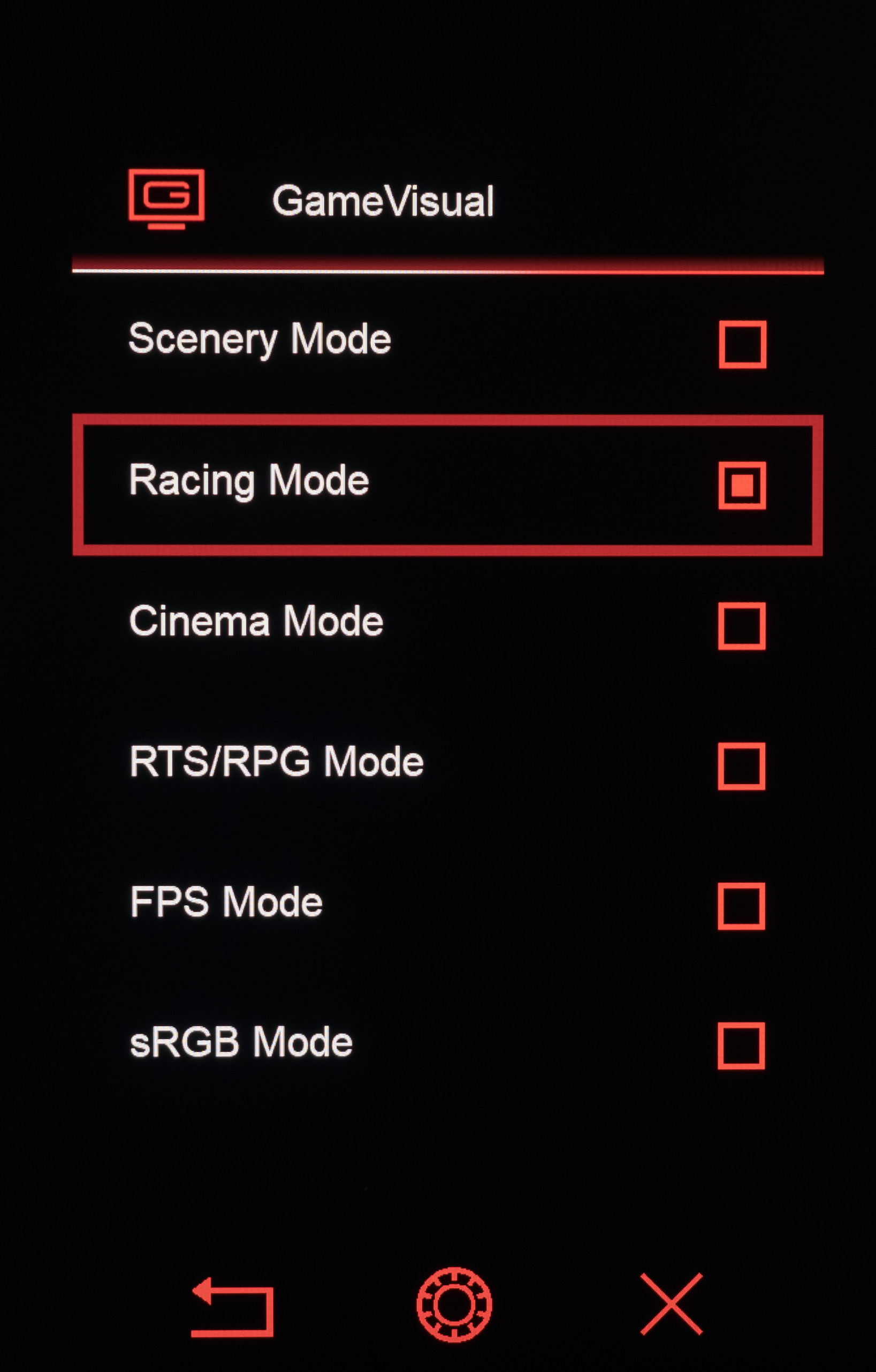 Центральная клавиша управления отвечает за включение/выключение монитора и выбор, другая является кнопкой отмены или выхода из раздела и совмещает в себе возможность для активации функции с быстрым доступом в дополнение к правой кнопке. Обе могут быть перенастроены через специальный раздел меню, где будет предложено достаточно много вариантов. По умолчанию же они настроены для активации игрового таймера/настраиваемого прицела/счётчика FPS (функция GamePlus) и быстрого переключения предустановленных режимов GameVisual.